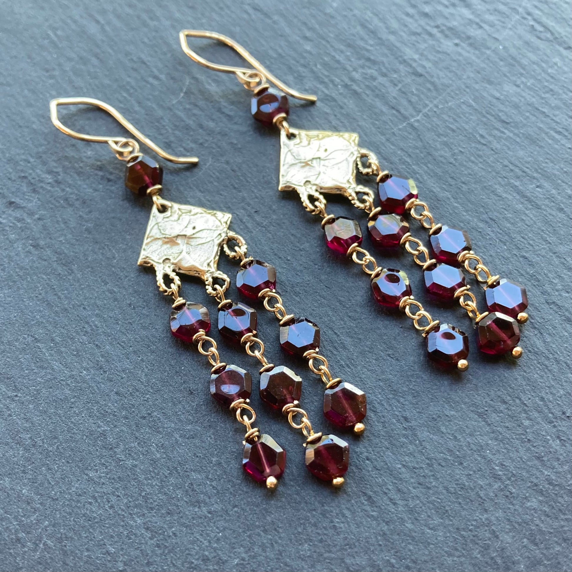 These handmade, one of a kind earrings feature artisan bronze 15mm diamond links with a fringe of burgundy Rhodolite Garnet 6mm faceted hexagons, hand wrapped in 14k gold filled wire, and are finished with my hand forged 14k gold filled ear wires. Earrings measure 3” in length and weigh 1.5 grams each.