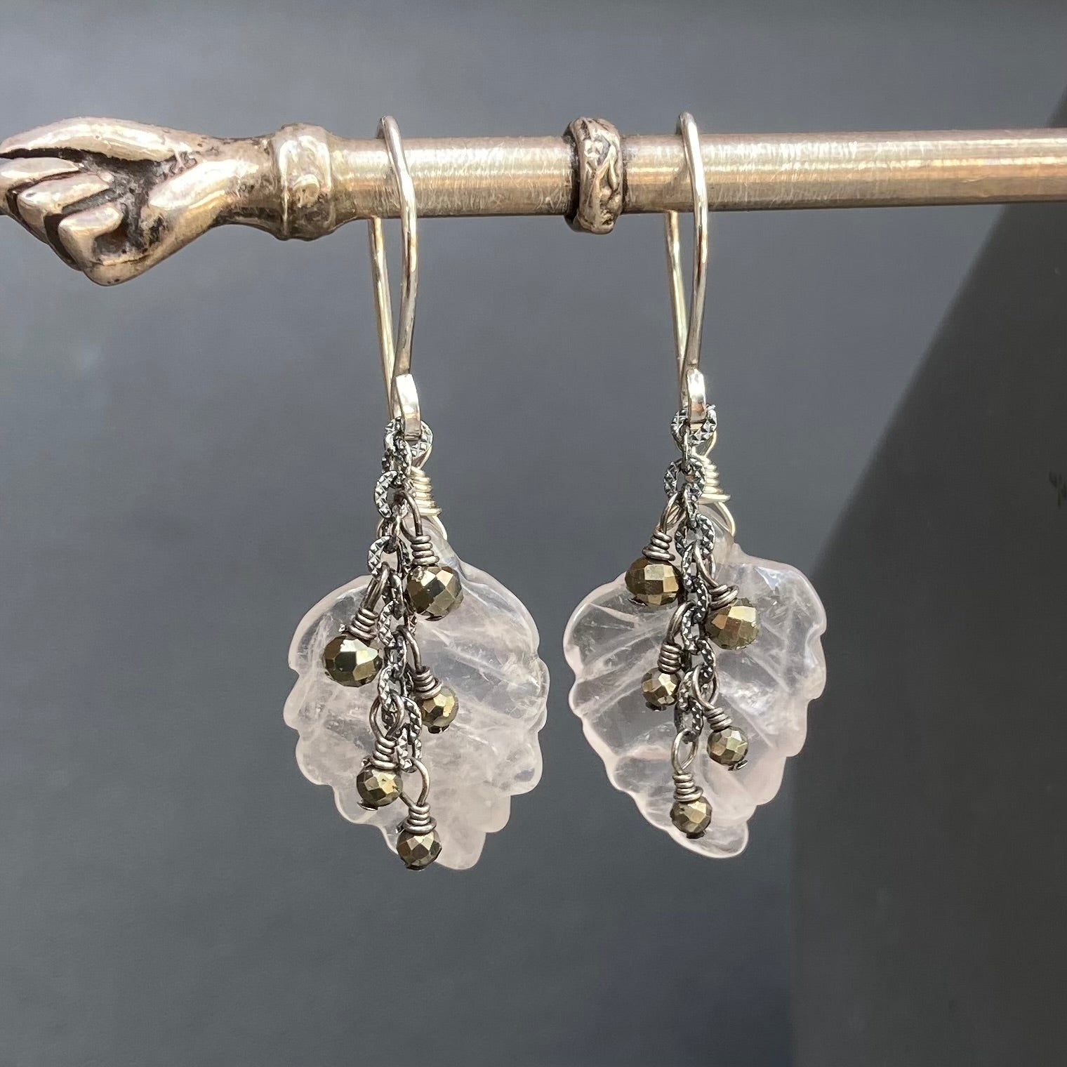 Rose Quartz, Pyrite & Sterling Silver Winter Leaf Earrings