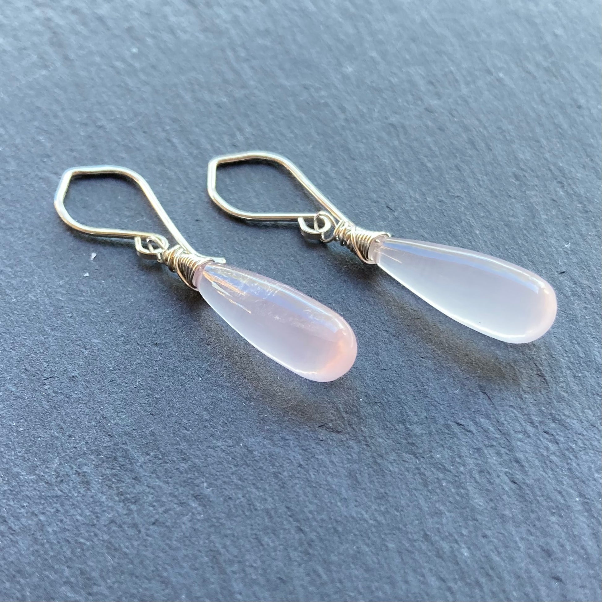 These handmade, one of a kind earrings feature pale pink Natural Rose Quartz 7x22mm long, smooth, teardrop briolettes, hand wrapped in sterling silver wire and are finished with my hand forged sterling silver ear wires. Earrings measure 1.75” in length.