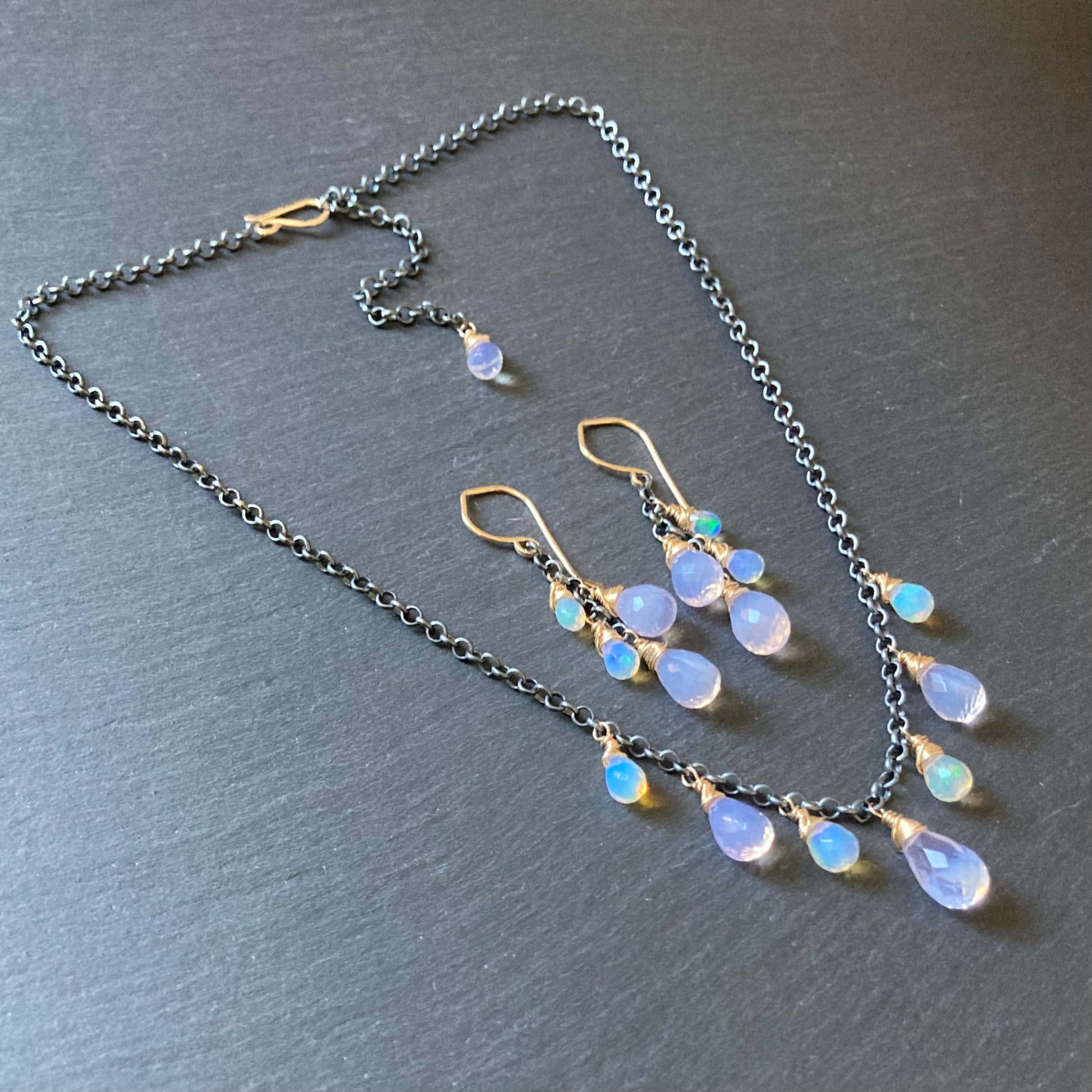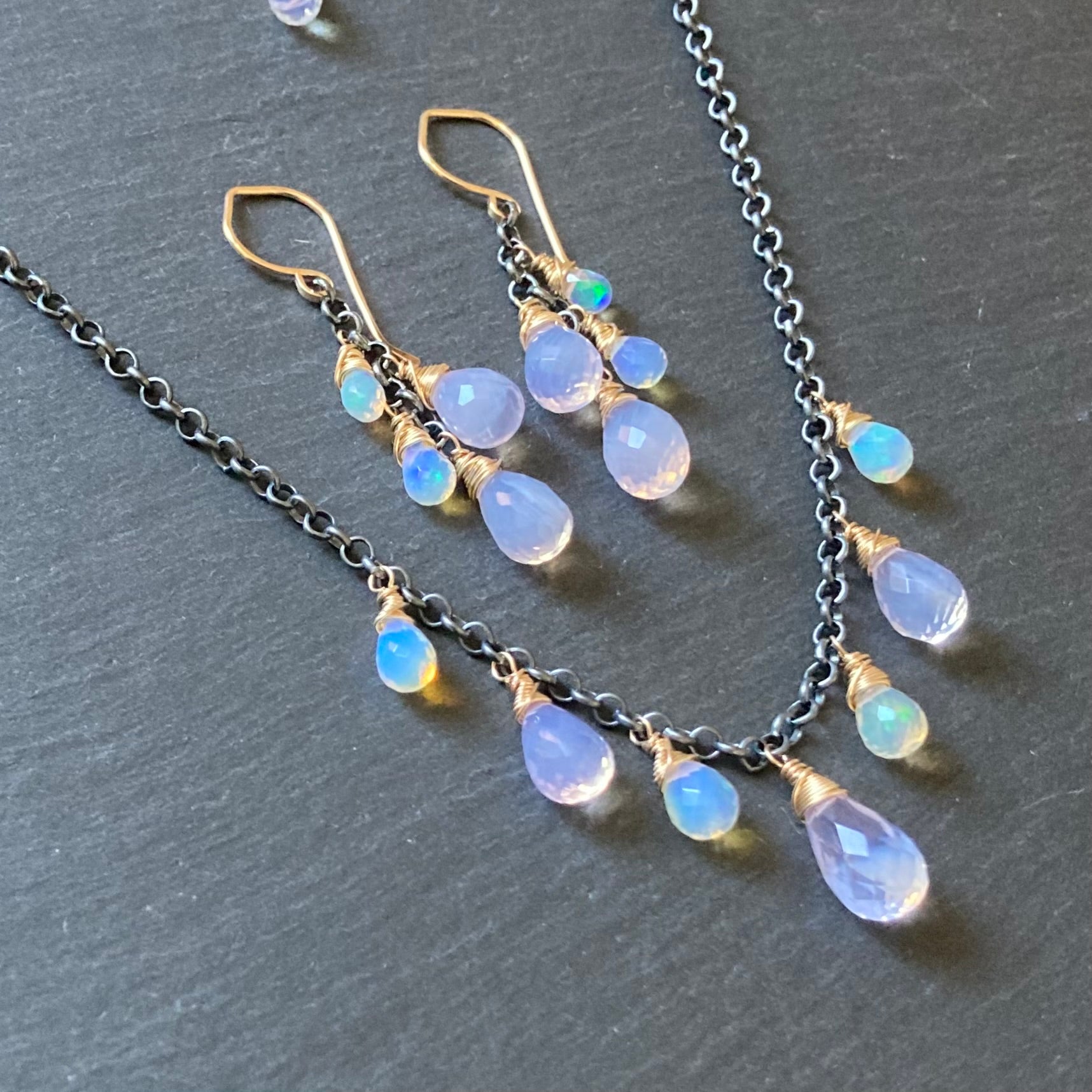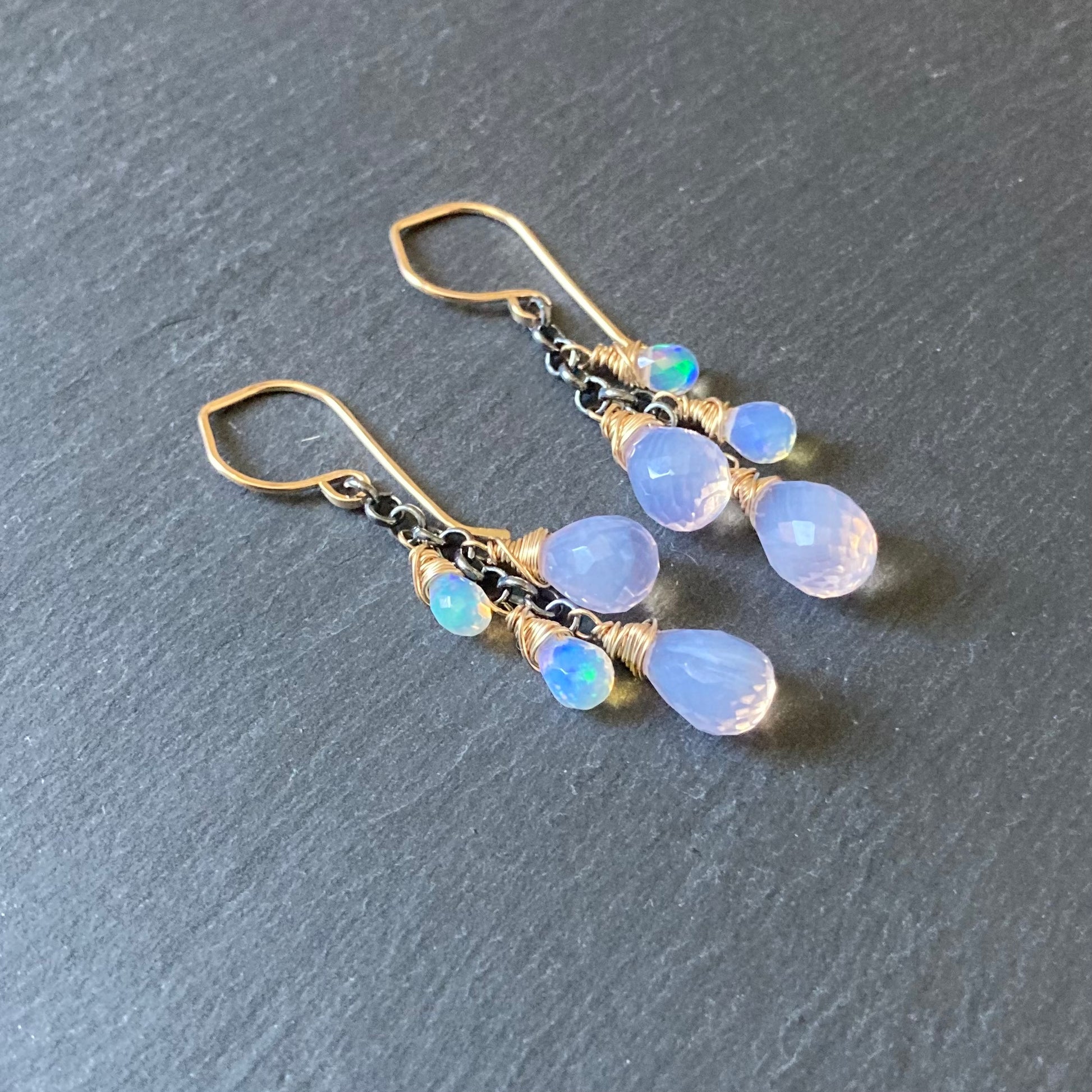 These handmade, one of a kind earrings feature fiery, gem grade AAA Ethiopian Opal and gorgeous lavender Natural Scorolite (aka Lavender Quartz) faceted teardrop briolettes, hand wrapped 14k gold filled wire suspended from oxidized sterling silver Rolo chain and are finished with my hand forged 14k gold filled ear wires. Earrings measure 2” in length. Coordinating pieces listed and sold separately.