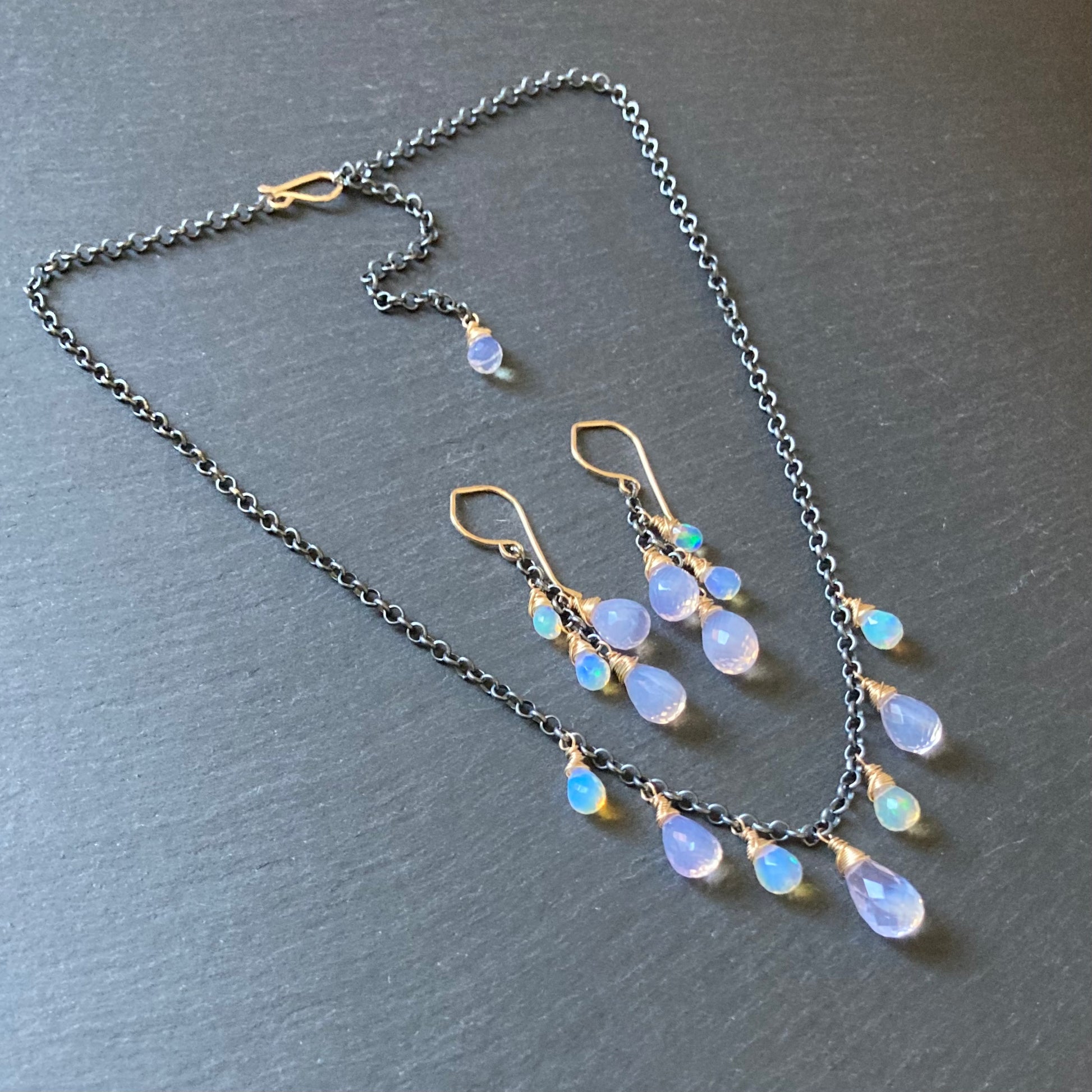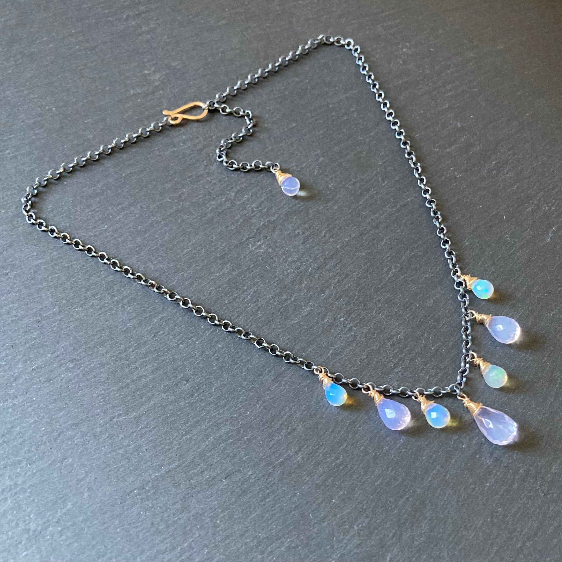 This handmade, one of a kind necklace features fiery, gem grade AAA Ethiopian Opal and Natural Scorolite (aka Lavender Quartz) faceted teardrop briolettes, hand wrapped in 14k gold filled wire, suspended from oxidized sterling silver Rolo chain. Hand forged hook clasp is 14k gold filled and can be hooked on any of the chain links for an adjustable length up to 18”. Coordinating pieces listed and sold separately.
