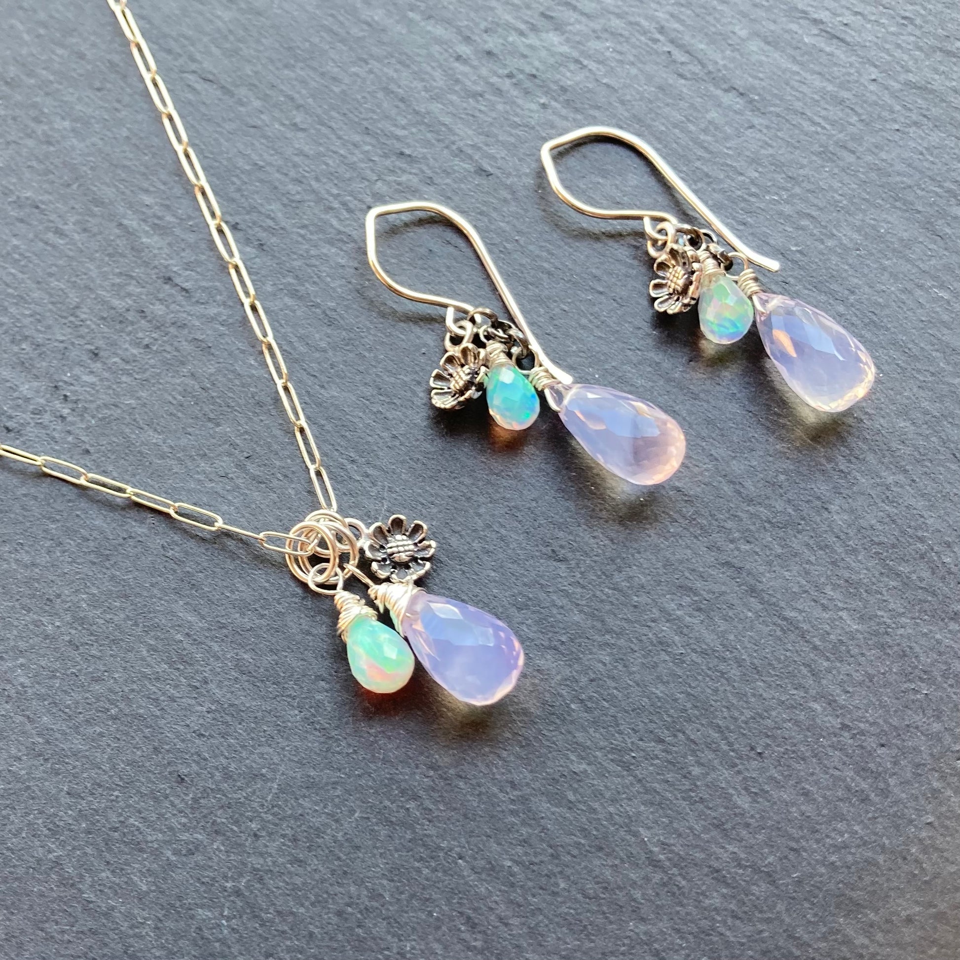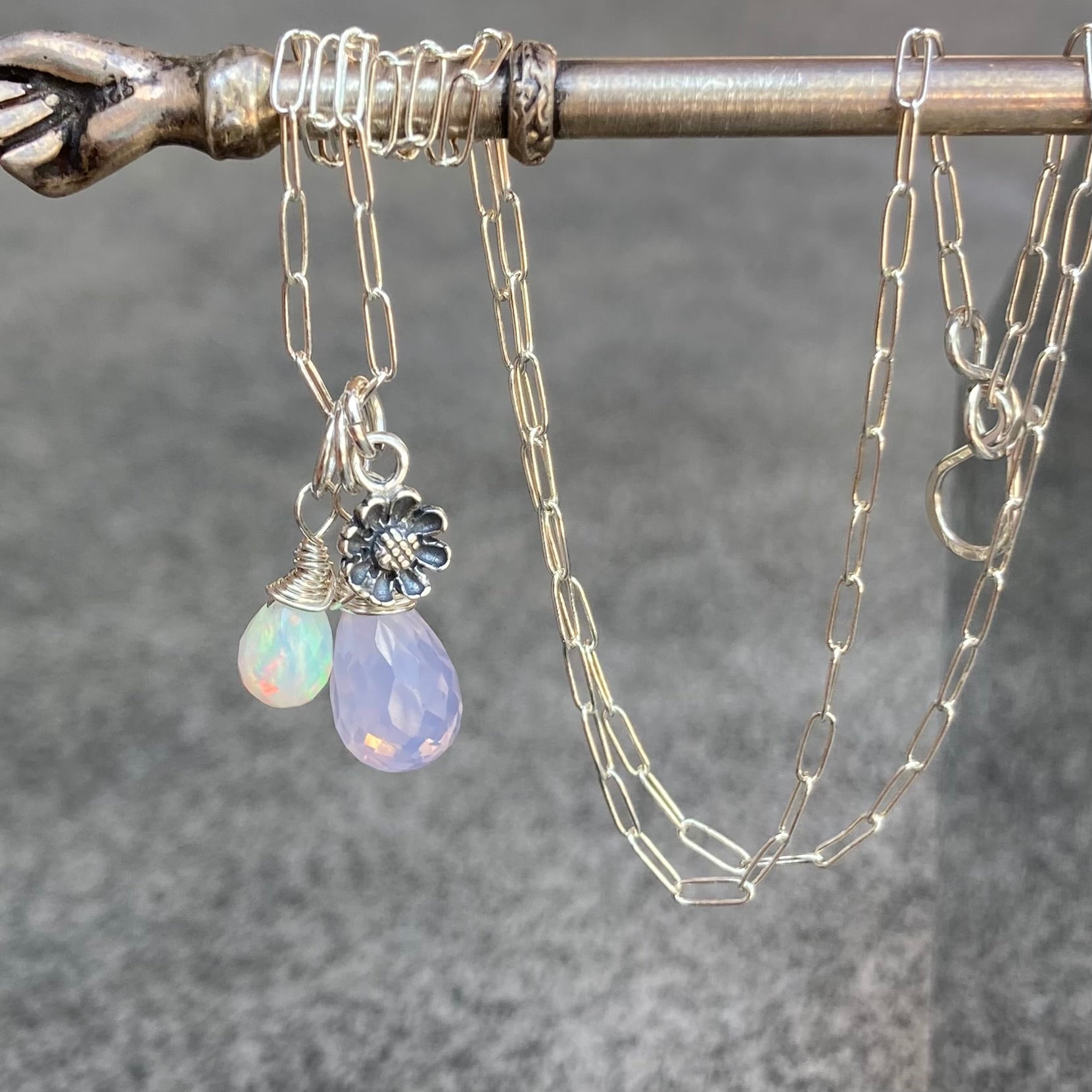 This handmade, one of a kind necklace features a AAA Natural Scorolite (aka Lavender Quartz) and fiery AAA Ethiopian Opal faceted teardrop briolettes, hand wrapped in sterling silver wire paired with a sterling silver 6mm cherry blossom charm on a 16” sterling silver dainty paperclip chain and is finished with a hand forged sterling silver hook and eye clasp. Coordinating pieces listed and sold separately.