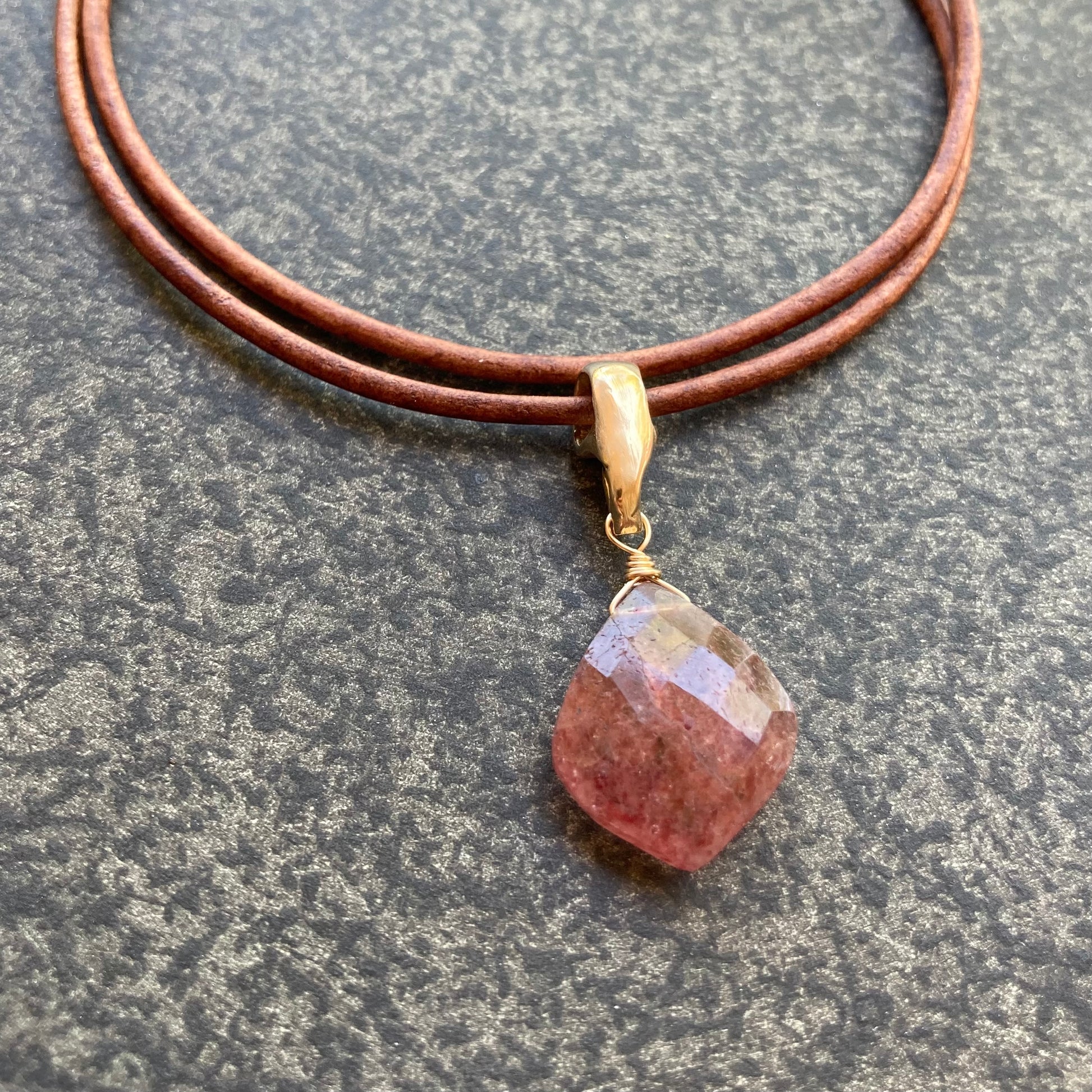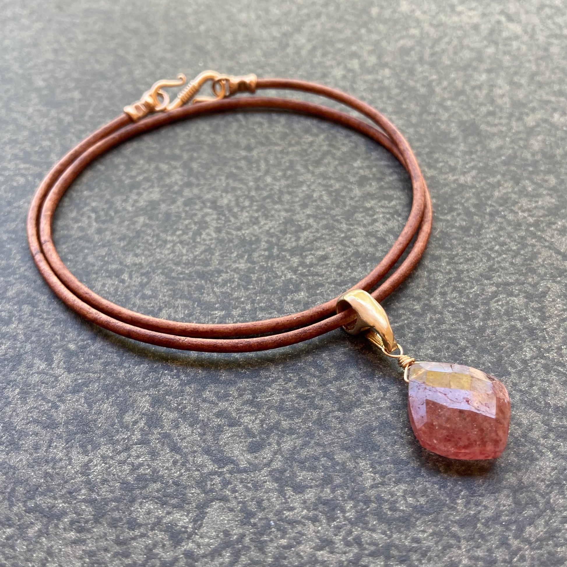 This handmade, one of a kind choker features a hand cut, faceted Strawberry Quartz 15x18mm fancy briolette hand wrapped in 14k gold filled wire, hanging from an artisan bronze bail on a red-brown 2mm genuine leather cord. S-hook clasp and all hardware is bronze. Choker measures 16 inches in length.