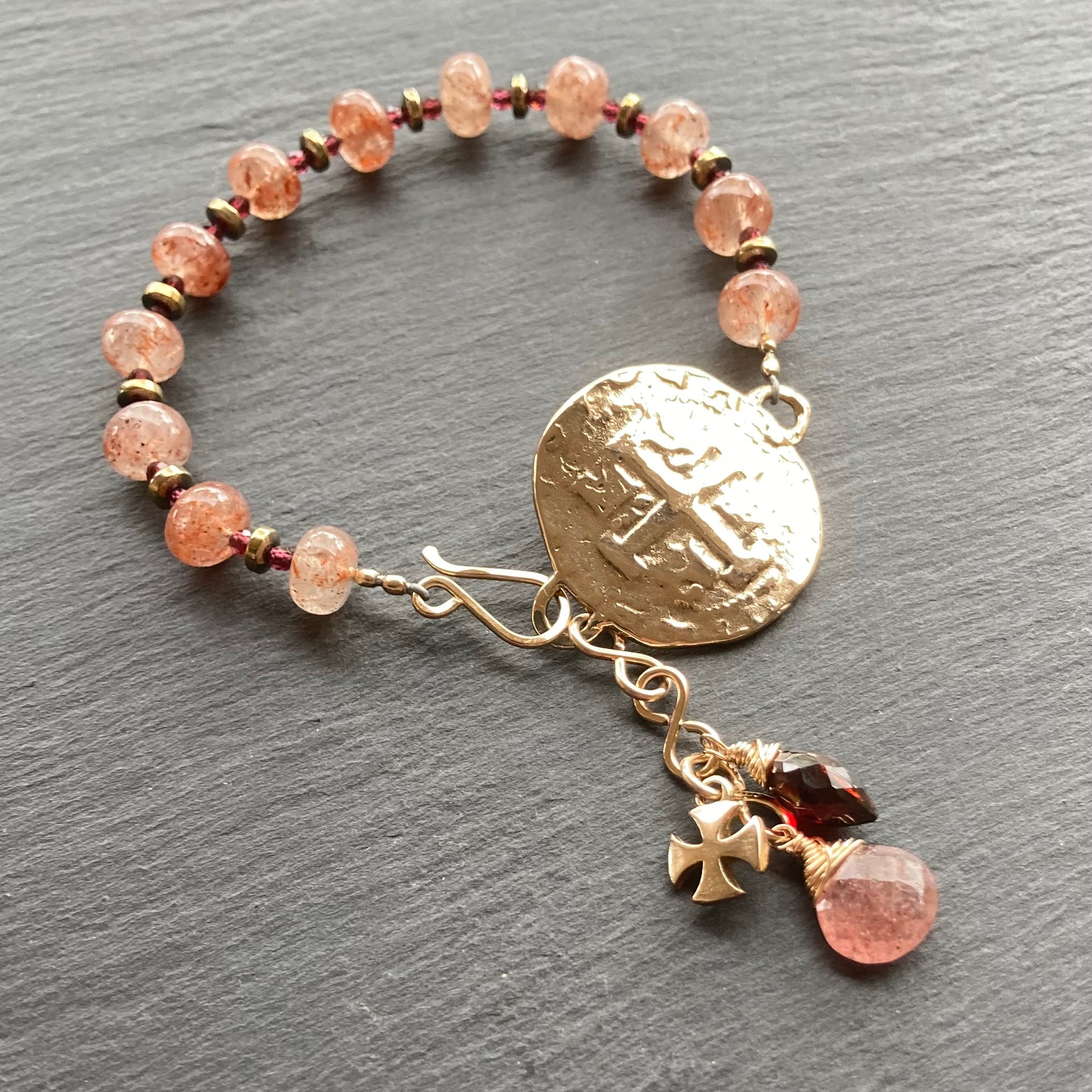 Strawberry Quartz & Bronze Spanish Coin Bracelet