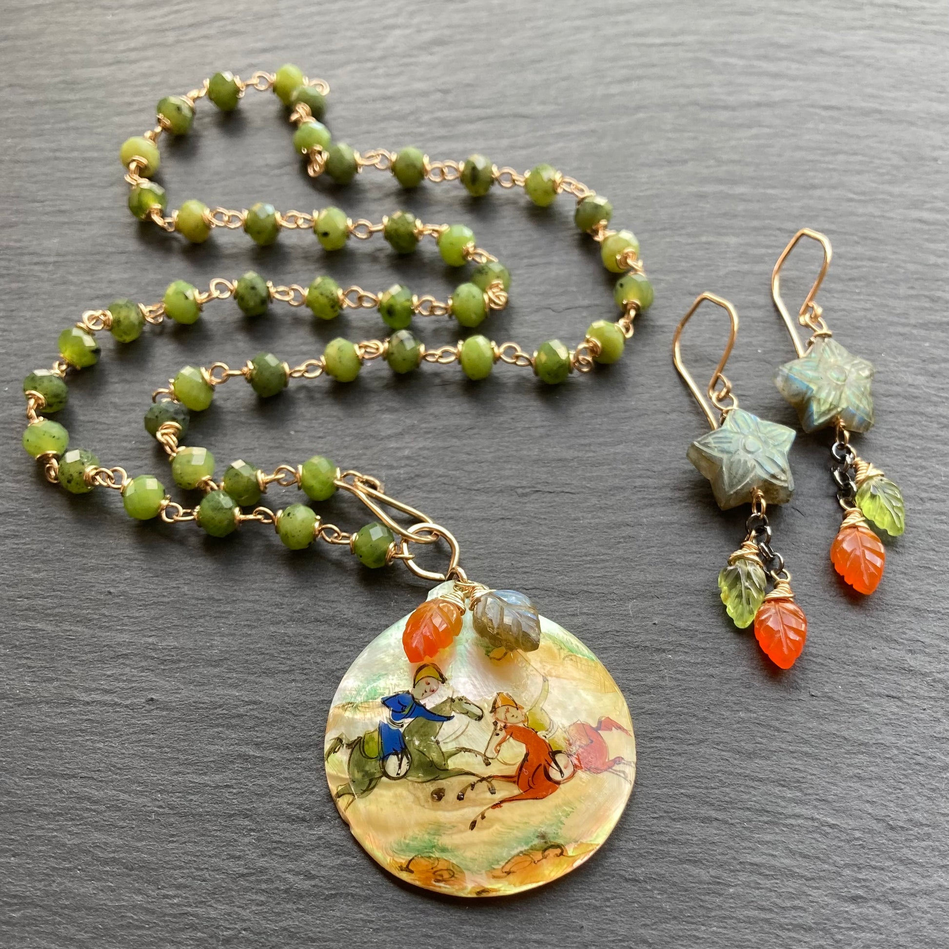 This handmade, one of a kind necklace features a vintage (1940’s) Persian Nassim Mother of Pearl 35x40mm (1.5”) pendant that has a hand painted scene depicting two riders on horseback playing polo on a handmade chain of translucent, speckled, olive green, Natural Canadian Nephrite Jade 6mm faceted rondelles that I’ve hand wrapped in 14k gold filled wire and finished with a hand forged 14k gf bail with hand carved Labradorite and Carnelian leaf charms and a front facing hook clasp. Necklace measures 18.25” in length. Coordinating pieces listed and sold separately.