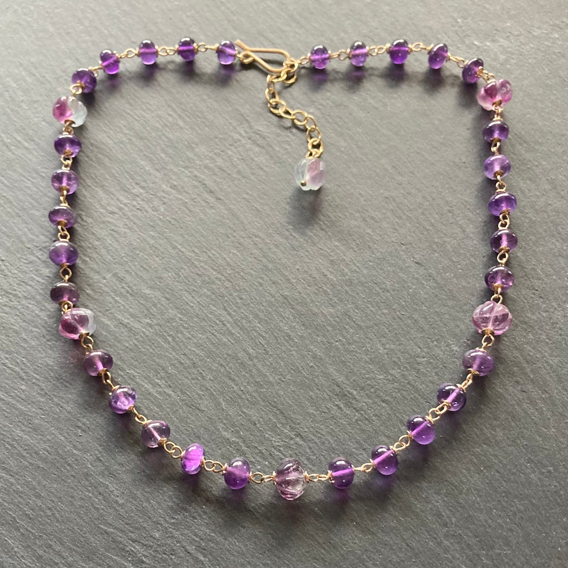 This handmade, one of a kind choker features dark purple Natural Amethyst 6.5mm smooth rondelles and bicolor Natural Fluorite hand carved melons, hand wrapped in 14/20 gold filled wire and is finished with a hand forged 14k gold filled hook clasp and 2” extension chain. Choker measures 15-17” in length. Coordinating pieces listed and sold separately.