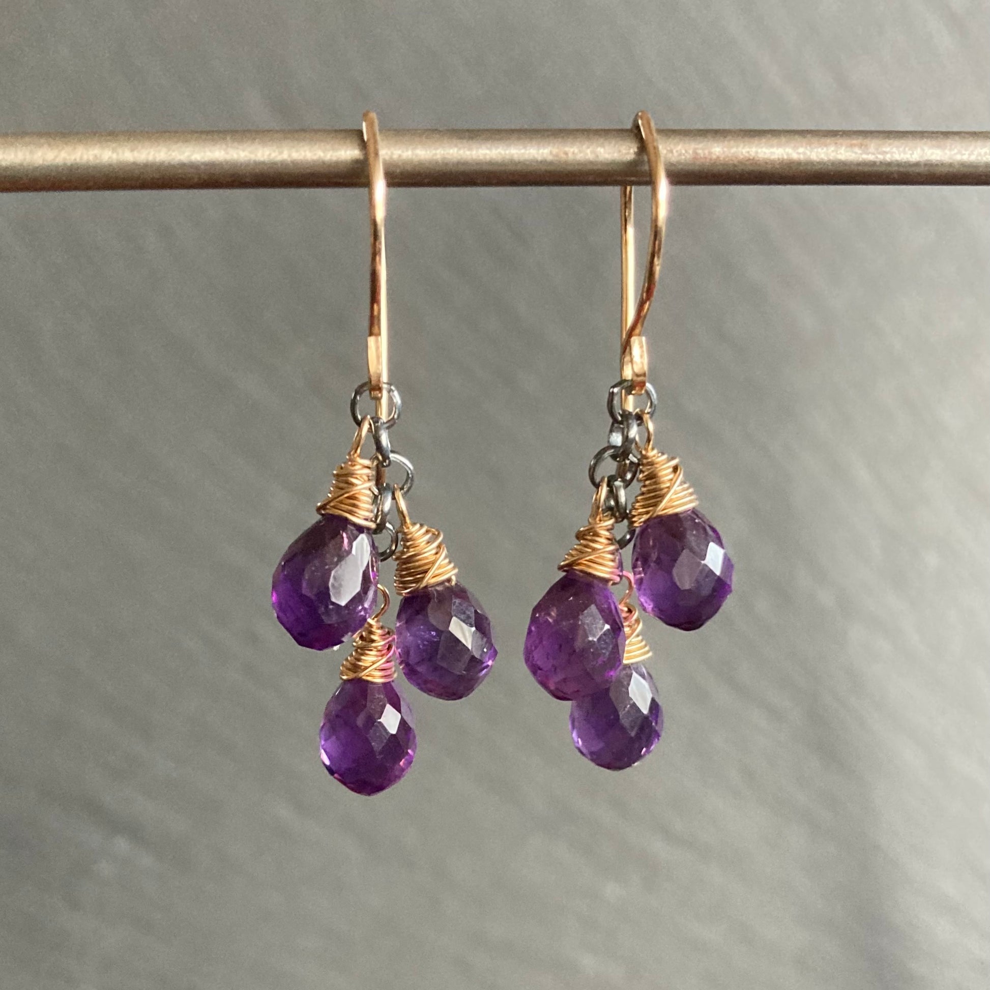 These handmade, one of a kind earrings feature gorgeous purple Natural African Amethyst faceted teardrop briolettes, hand wrapped in 14/20 gold filled wire, suspended from oxidized sterling silver rolo chain and are finished with my hand forged 14/20 gf ear wires. Earrings measure 1 5/8” in length. Coordinating pieces listed and sold separately.