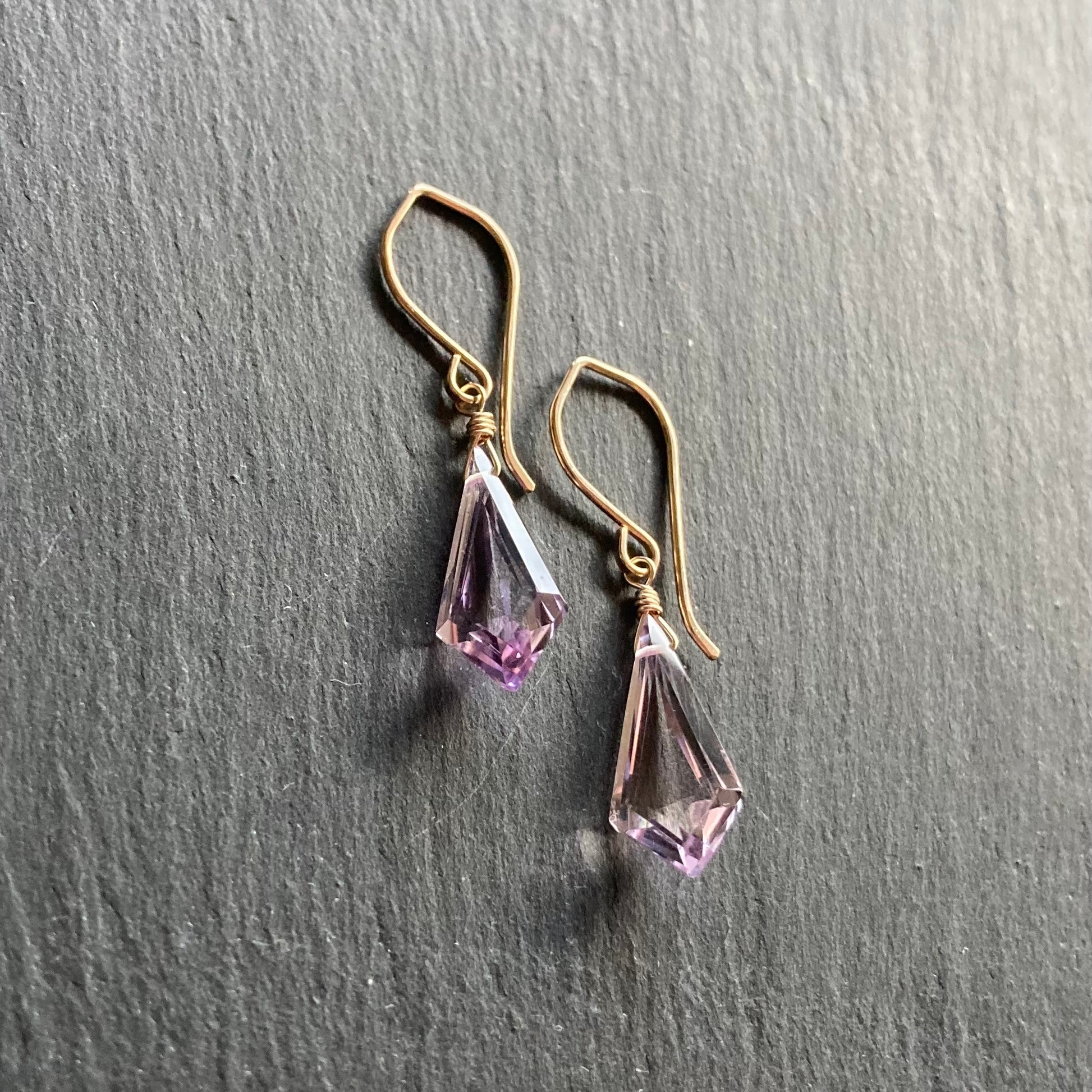 These handmade, one of a kind earrings feature gem grade AAA Natural Ametrine 9x18mm concave cut kites, hand wrapped in 14/20 gold filled wire and are finished with my hand forged 14/20 gf ear wires. Earrings measure 1.5” in length.