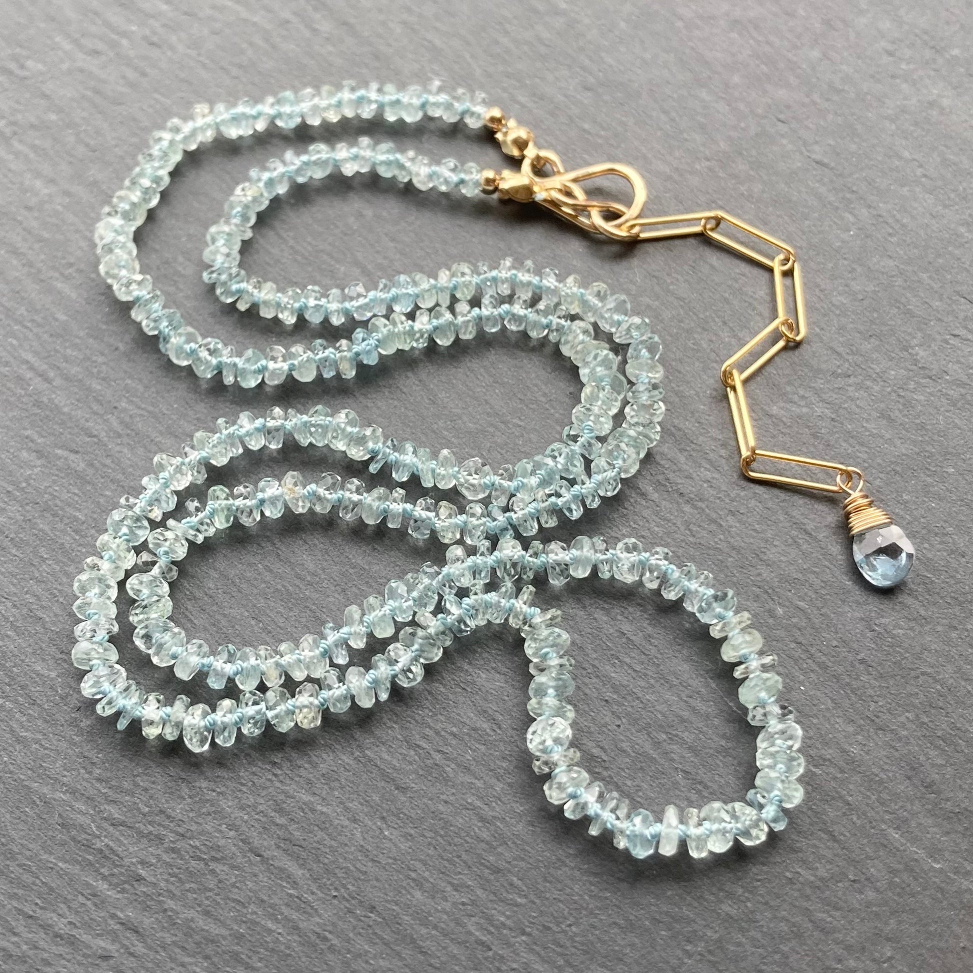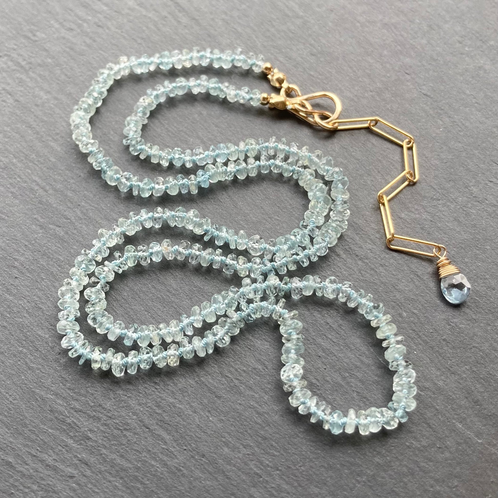 This handmade, one of a kind necklace features AAA Natural Aquamarine 3-4mm hand cut, faceted rondelles hand knotted on aqua silk cord and is finished with 14/20 gold filled hardware including a hand forged hook and eye clasp and clasp 2” extension chain. Necklace is adjustable from 20.5-22.5” in length. Coordinating pieces listed and sold separately.