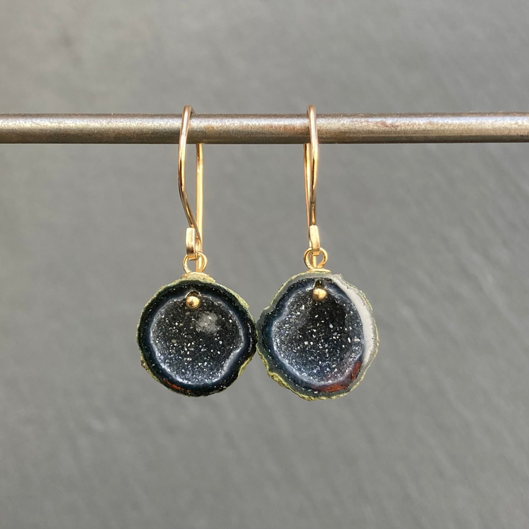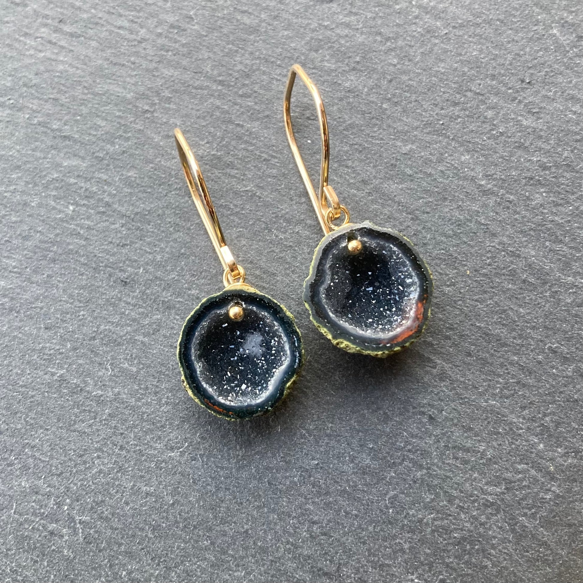These handmade, one of a kind earrings feature 13mm Natural Tabasco Geodes with sparkling black druzy, hand wrapped in 14k gold filled wire and are finished with my hand forged 14k gold filled ear wires. Earrings measure 1.25” in length.