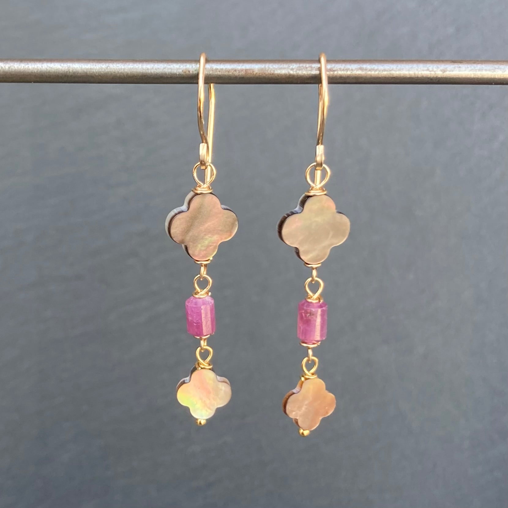 These handmade, one of a kind earrings feature AAA Black Mother of Pearl 8/10mm hand carved clovers and AAA Natural Ruby hand cut, faceted tubes, hand wrapped in 14/20 gold filled wire and are finished with my hand forged 14/20 gf ear wires. Earrings measure 2 1/8” in length. Coordinating pieces listed and sold separately.