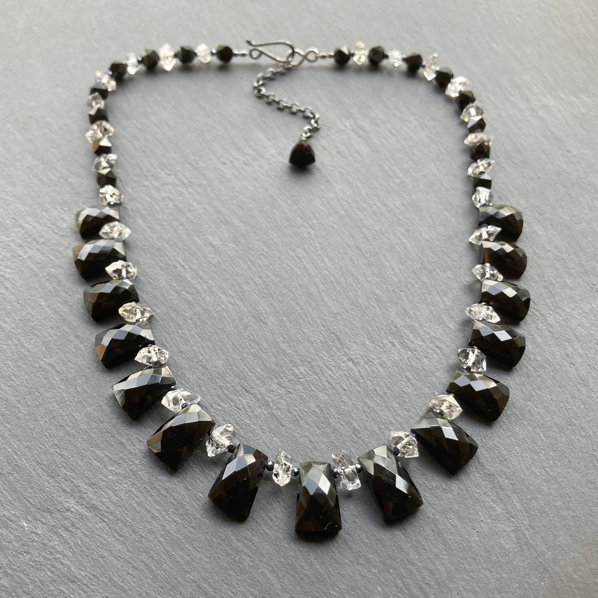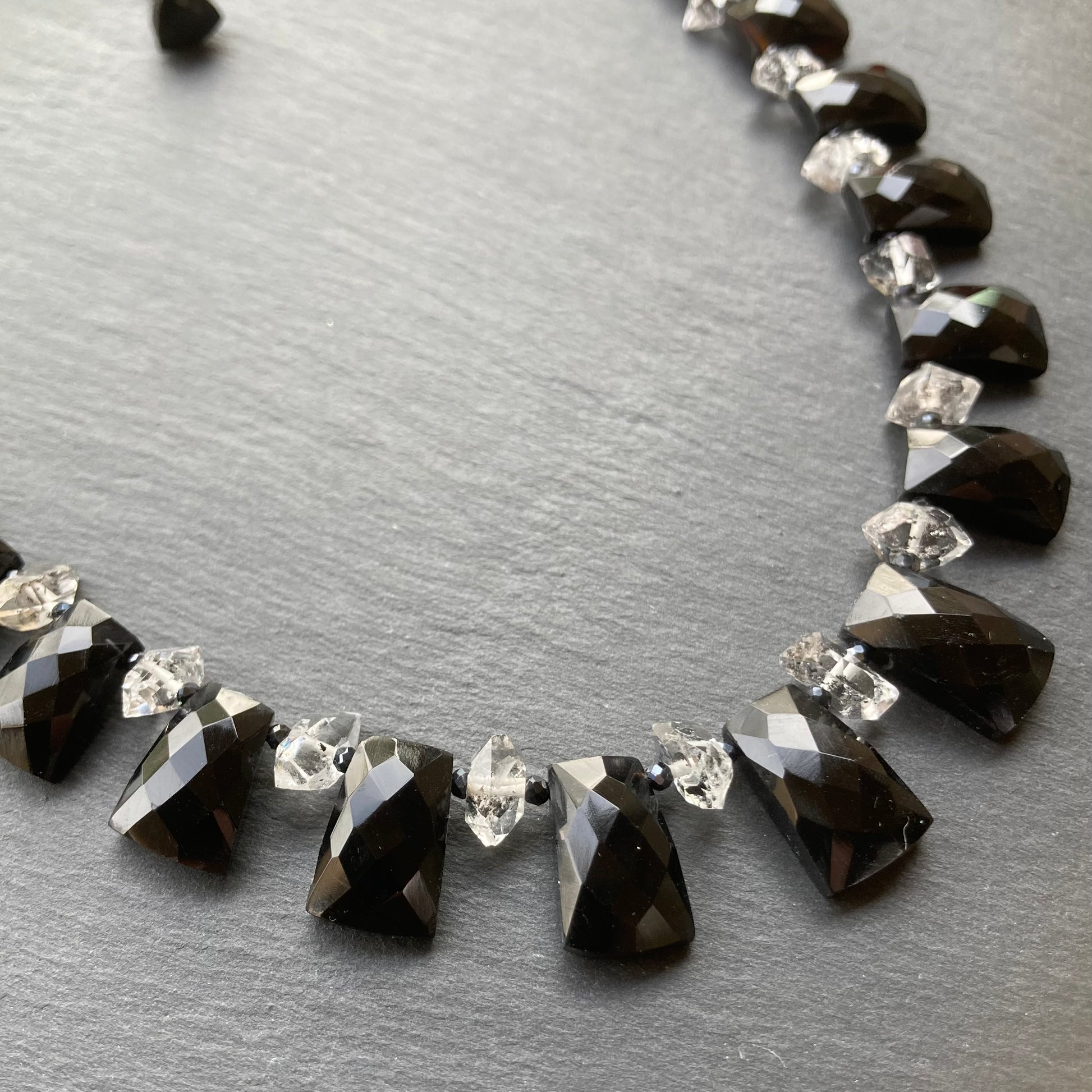 This handmade, one of a kind, beaded necklace features Black Onyx faceted shields and star cut rounds, Natural Herkimer Diamond double terminated raw Quartz Crystals flecked with black Anthraxolite inclusions and microfaceted Hematite and is finished with a hand forged oxidized sterling silver hook and eye clasp and 2” extension chain with a Black Onyx trillion briolette charm. Necklace is adjustable from 16.75-18.75” in length. Coordinating pieces listed and sold separately.