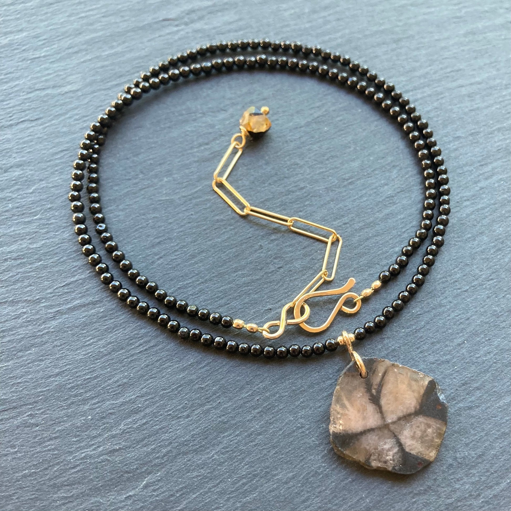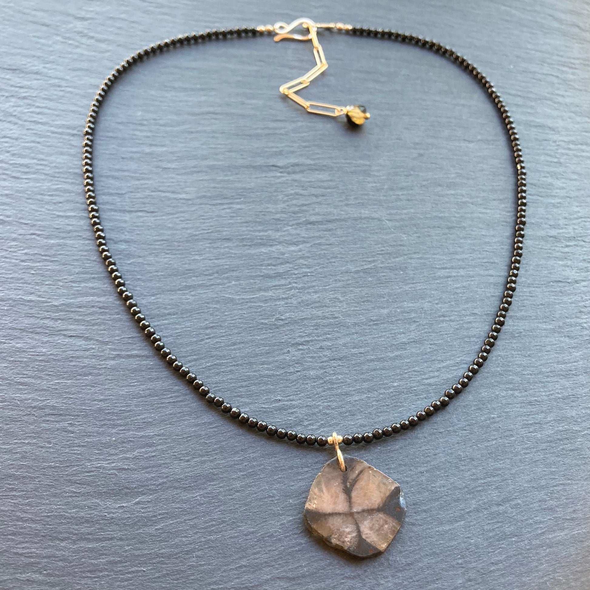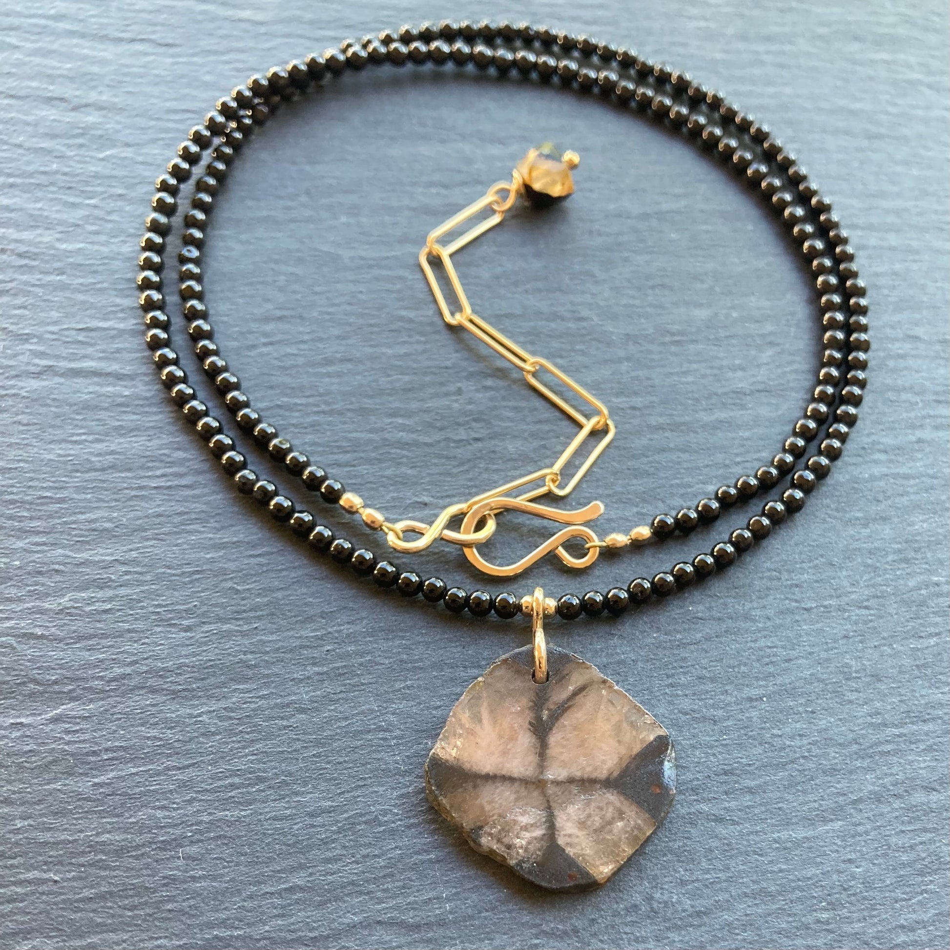 This handmade, one of a kind necklace features a translucent Natural Chiastolite (aka: Christ Stone: a variety of the mineral Andalusite, noted for its distinctive cross shaped inclusions of graphite) 22mm slice on a beaded necklace of Natural Black Tourmaline 2mm smooth rounds and is finished with 14/20 gold filled hardware including a hand forged bail and hook and eye clasp with a 2” extension chain for an adjustable length from 16.5-18.5”. Coordinating pieces listed and sold separately.