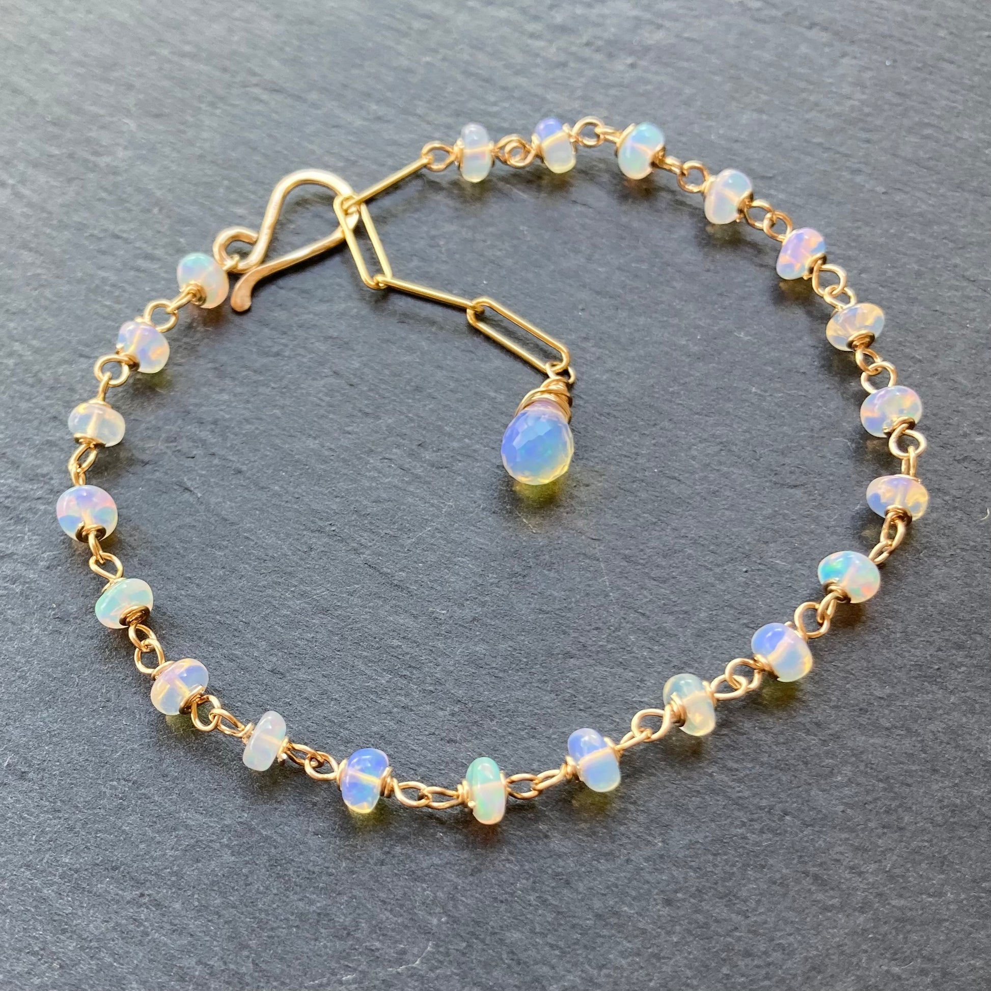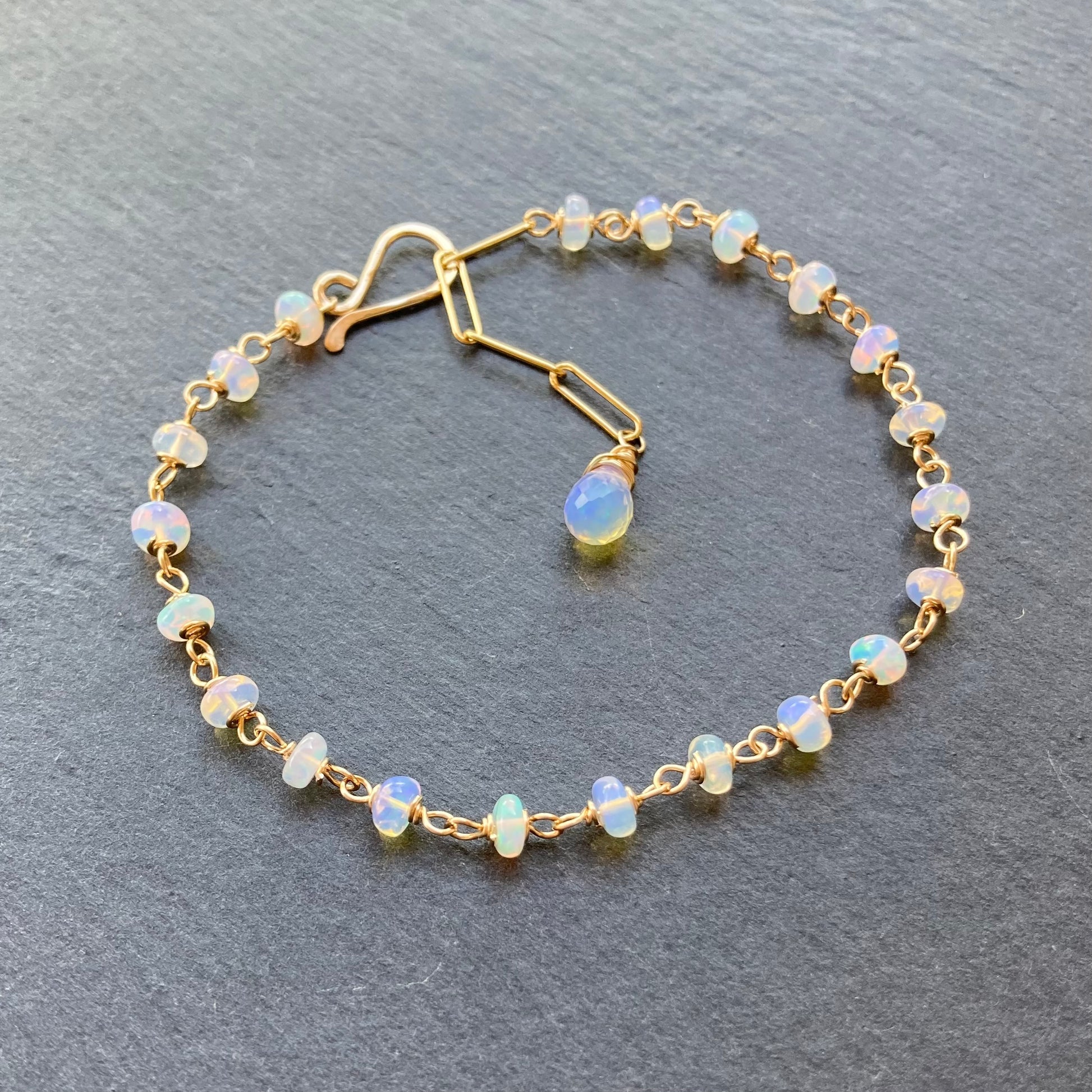 This handmade, one of a kind bracelet features iridescent AAA Ethiopian Opal 4.5mm smooth rondelles, hand wrapped in 14/20 gold filled wire and is finished with a hand forged 14/20 gf hook clasp and 1.25” extension chain with a Ethiopian Opal faceted teardrop briolette charm. Bracelet measures 8.75” in length and will fit up to an 8” wrist. (Bracelet can be shortened to your desired length for no additional charge) Coordinating pieces listed and sold separately.
