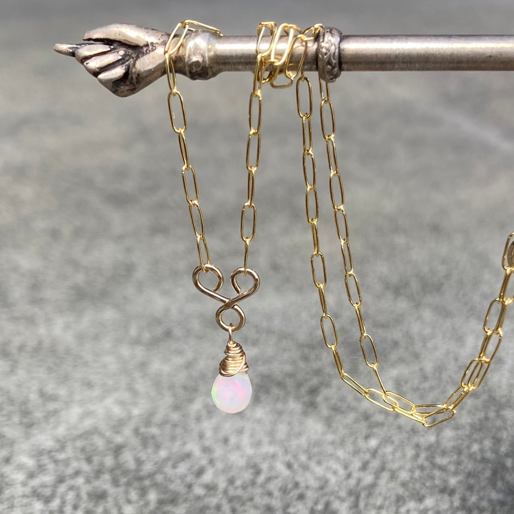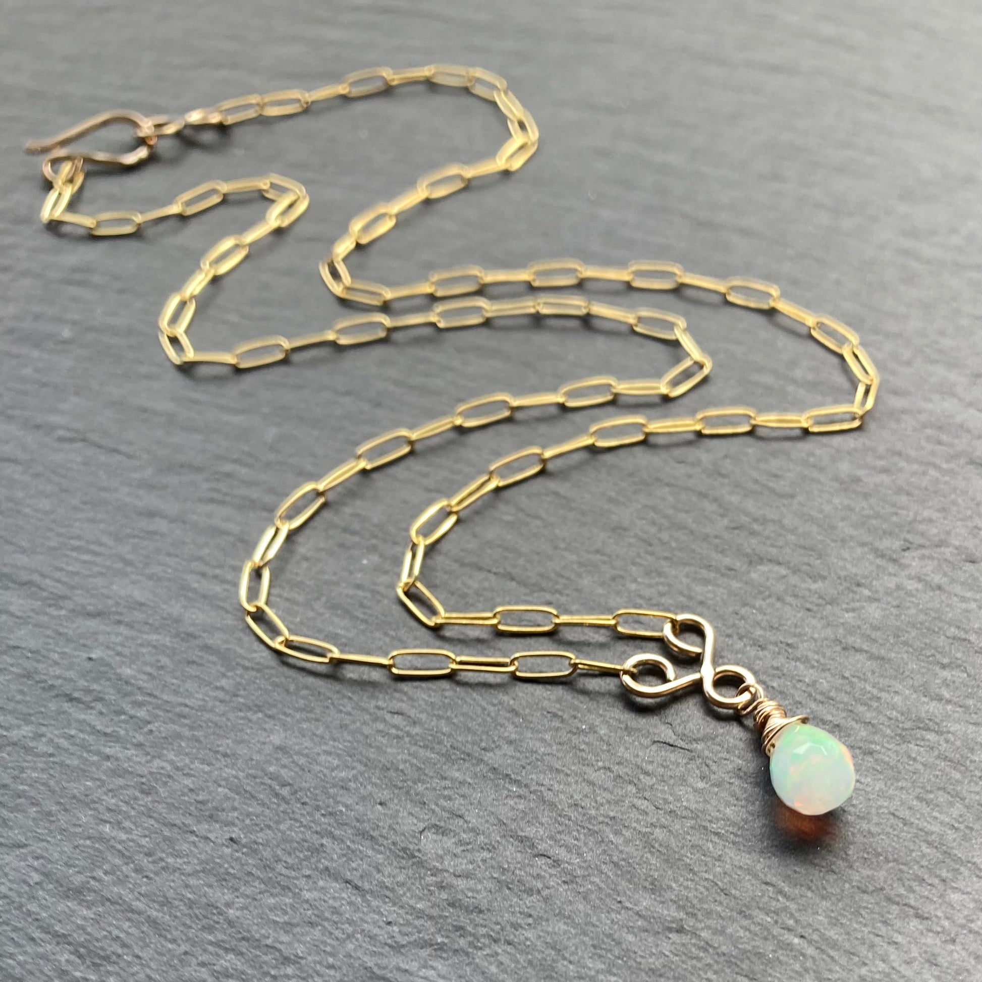 This one of a kind necklace features a fiery AAA Ethiopian Opal faceted teardrop briolette suspended from a hand forged 14k gold filled swirling link on a 16” dainty paperclip chain and is finished with a hand forged hook and eye clasp. Coordinating pieces listed and sold separately.