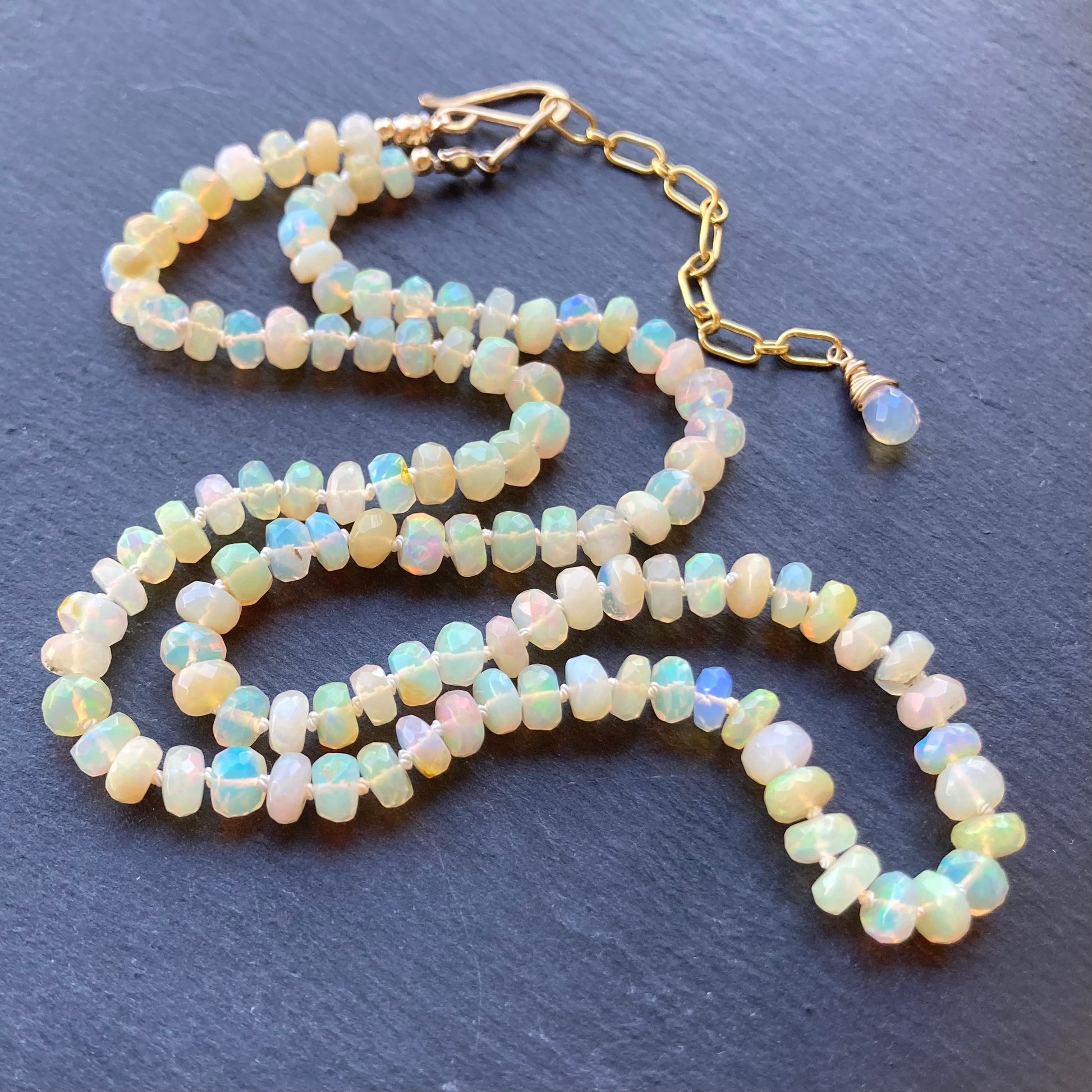 This handmade, one of a kind necklace features fiery AAA Ethiopian Opal 5.5mm hand cut, faceted rondelles, hand knotted on ivory silk cord and is finished with 14/20 gold filled hardware including a hand forged hook and eye clasp and 2” extension chain with an Ethiopian Opal faceted teardrop briolette charm. Necklace is adjustable from 18.5-20.5” in length. Coordinating pieces listed and sold separately.