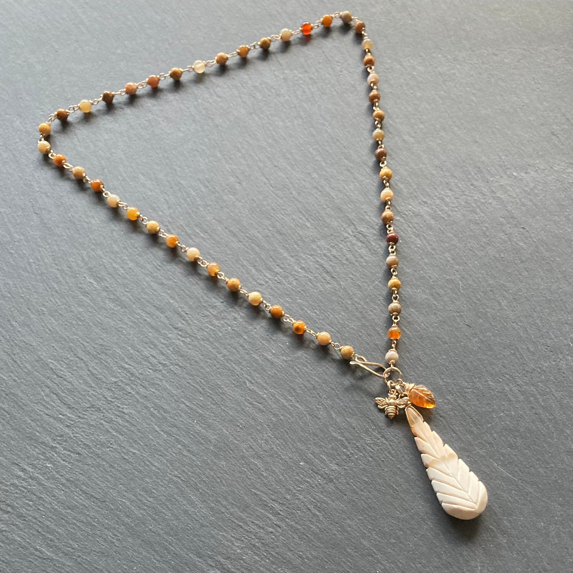 This handmade, one of a kind necklace features a Natural Dendritic Opal 16x44mm hand carved leaf, a Brandy Citrine hand carved leaf and a solid bronze 3D honeybee charm on a chain of multicolored red, yellow and orange Natural Agatized Fossil Coral (Indonesian) 4mm smooth rounds, hand wrapped in 14/20 gold filled wire and is finished with a hand forged 14/20 gf front-facing hook clasp and bail. Necklace measures 19” in length.