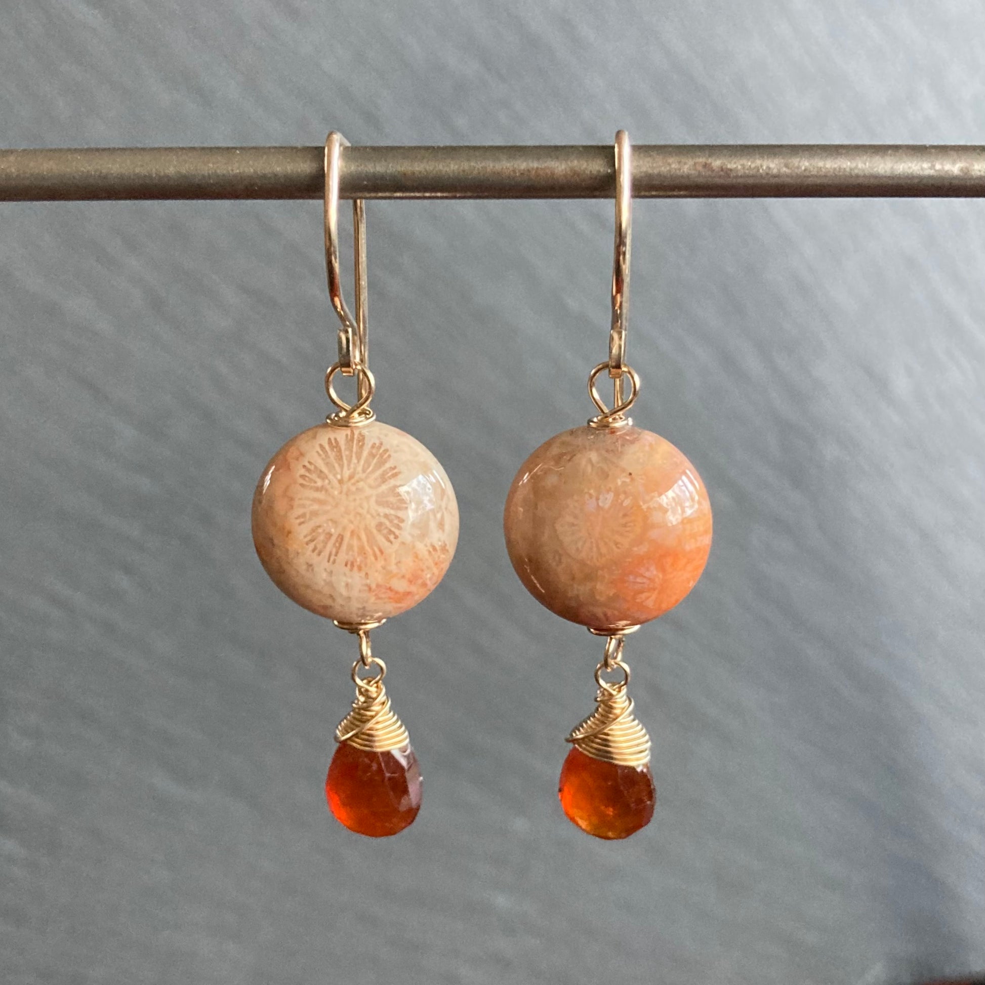 Fossil Coral, Hessonite Garnet & Gold Earrings