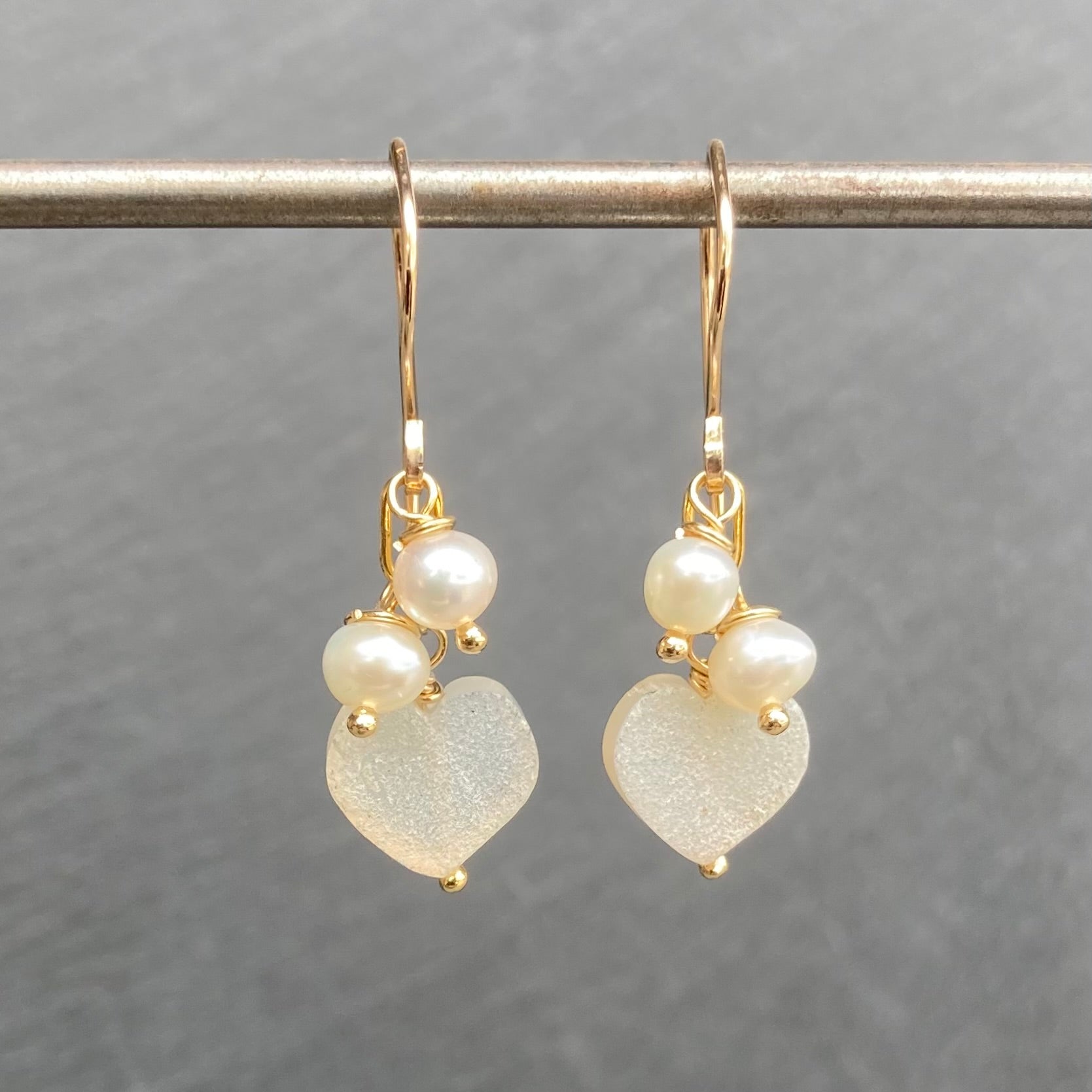 Freshwater Pearl, Druzy Heart & Gold Earrings