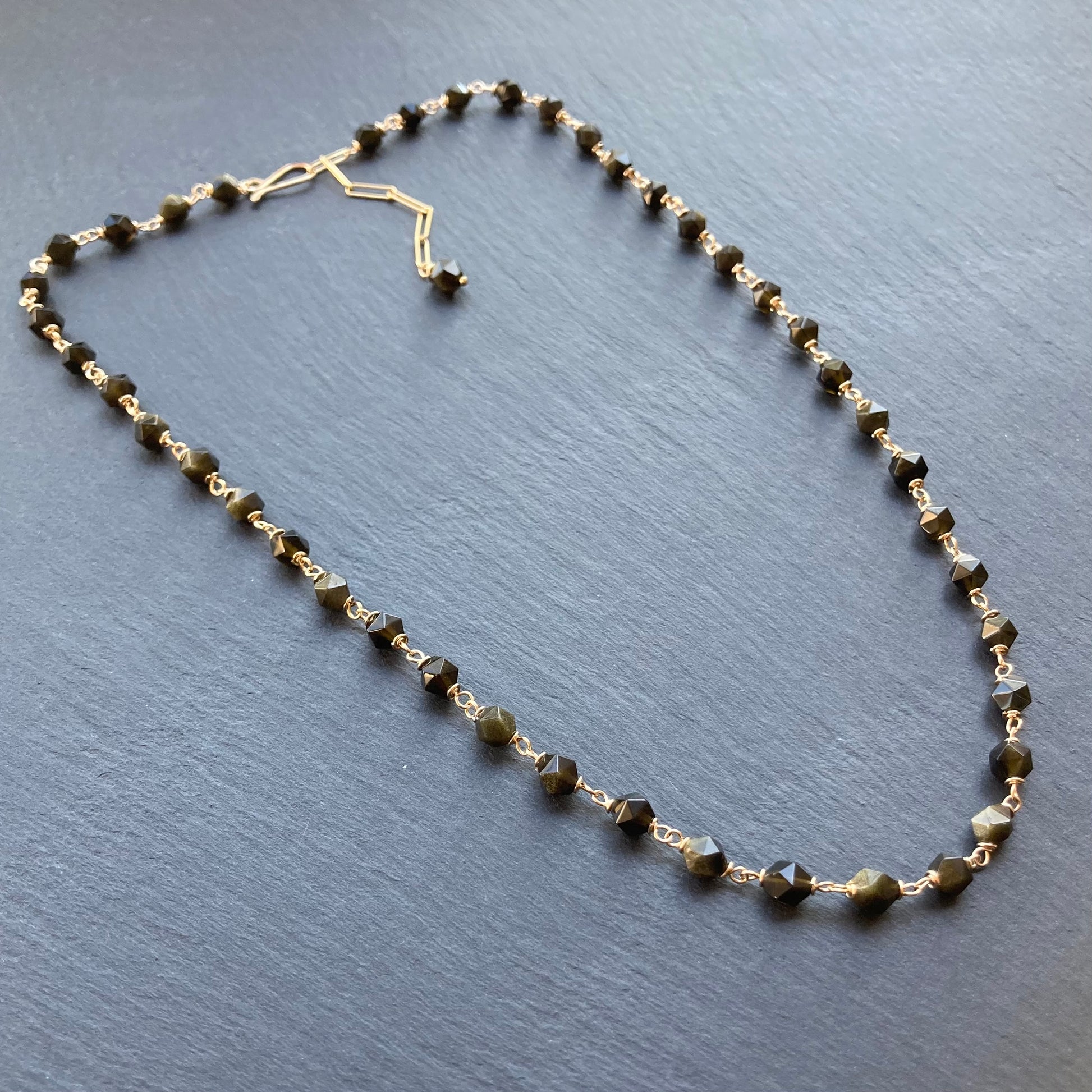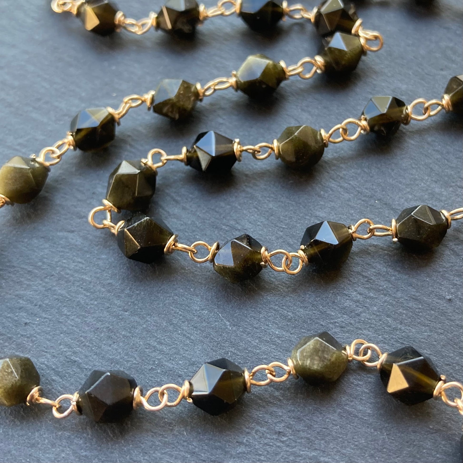 This handmade, one of a kind necklace features shimmering Natural Golden Obsidian 6mm star cut beads, hand wrapped in 14/20 gold filled wire and is finished with a hand forged 14/20 gf hook clasp and 2” extension chain for an adjustable length up to 22.25”. Coordinating pieces listed and sold separately.