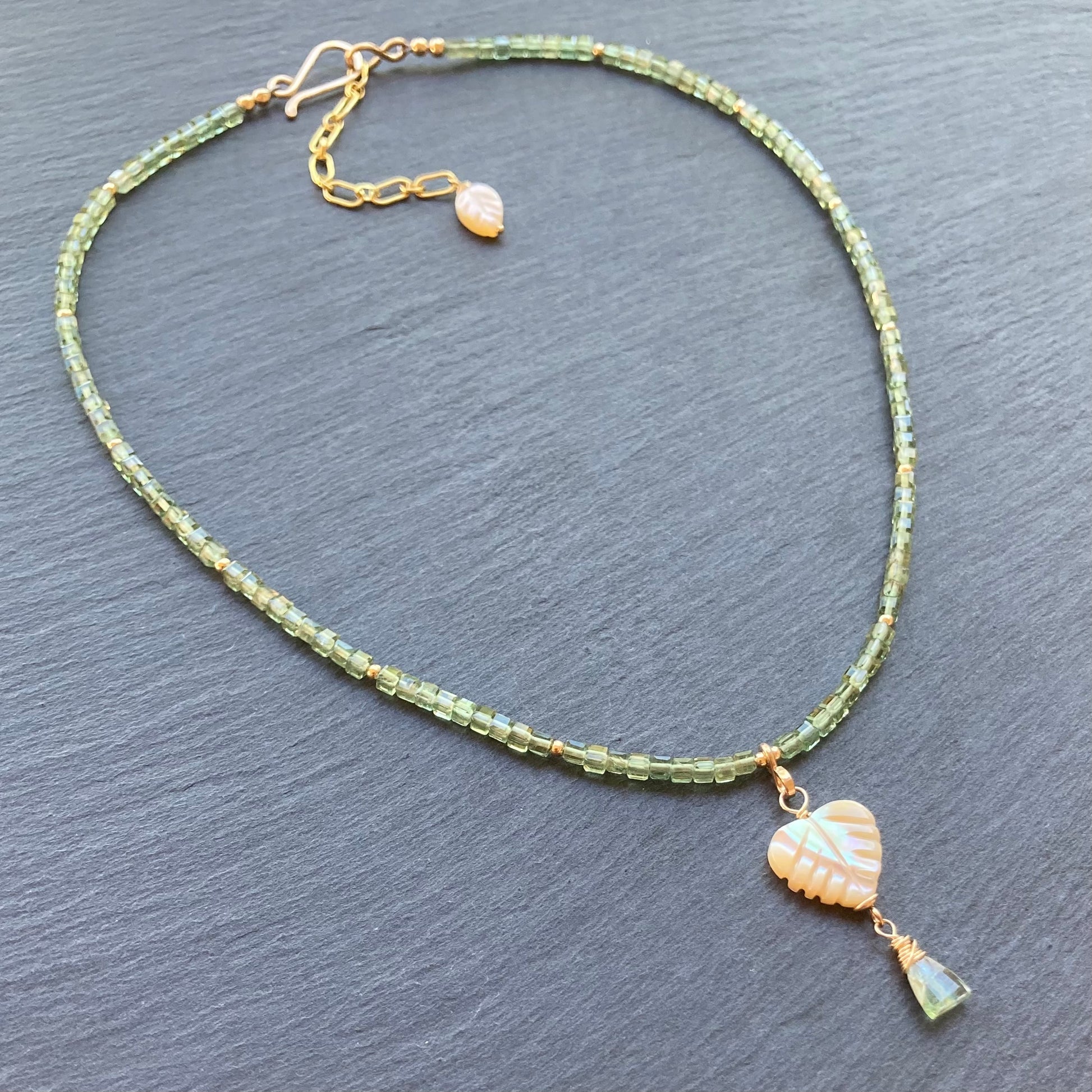 This handmade, one of a kind necklace features a Mother of Pearl 13mm hand carved palm heart pendant with a Natural Green Kyanite faceted trillion briolette, hand wrapped in 14/20 gold filled wire on a beaded necklace of AAA Green Apatite faceted cubes and 14/20 gf seamless rounds and is finished with a hand forged 14/20 gf hook and eye clasp and 2” extension chain with a Mother of Pearl hand carved leaf charm. Necklace measures 15-17” in length. Coordinating pieces listed and sold separately.