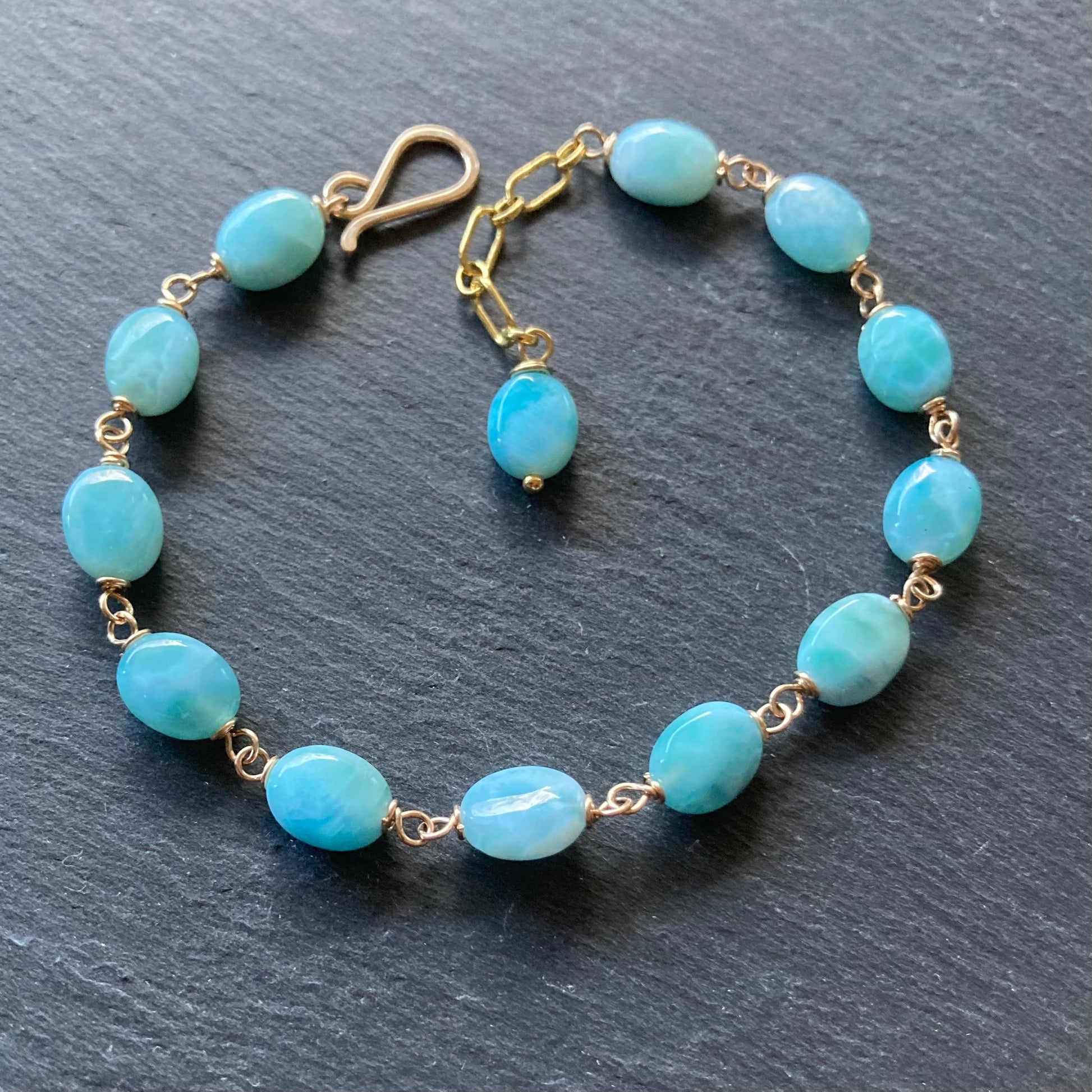 This handmade, one of a kind bracelet features gorgeous, watery, gem grade AAA Natural Larimar (Dominican Republic) 7x9mm smooth ovals, hand wrapped in 14/20 gold filled wire and is finished with a 14/20 gf hand forged hook clasp and 1” extension chain. Bracelet is adjustable to fit a 6-7” wrist. Coordinating pieces listed and sold separately.