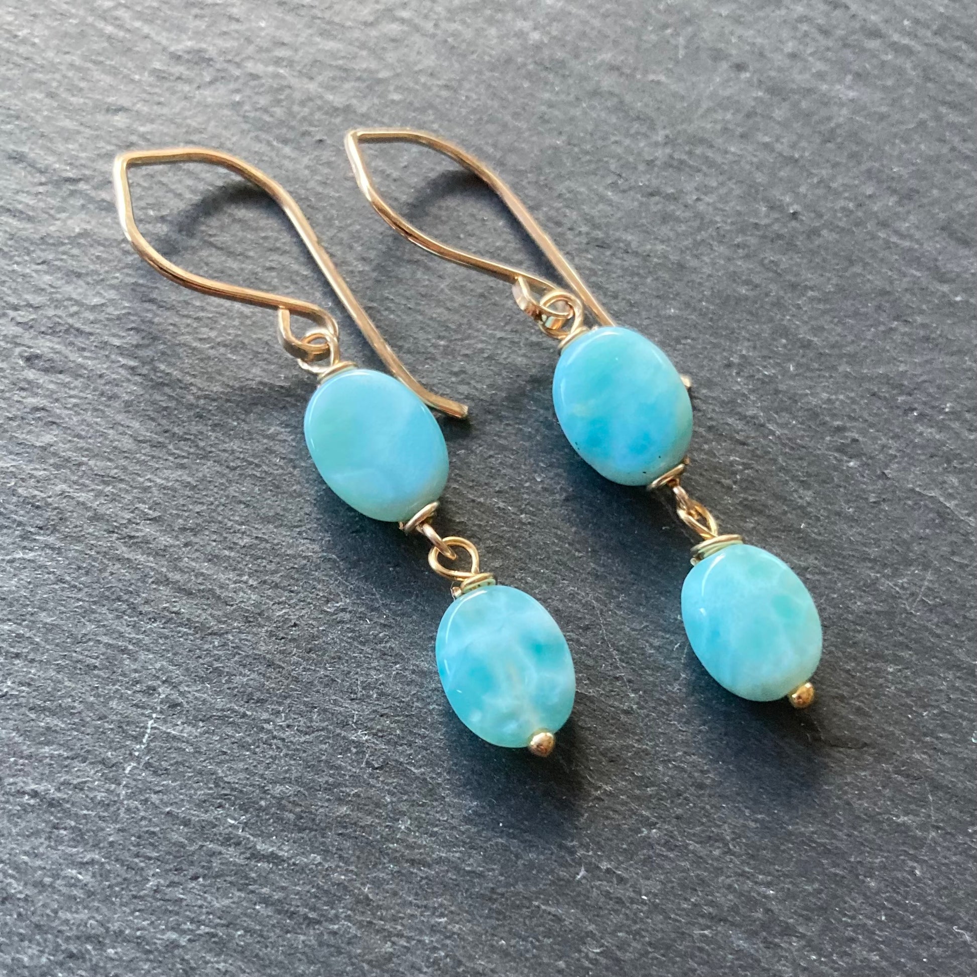 These handmade, one of a kind earrings feature gorgeous, watery, gem grade AAA Natural Larimar (Dominican Republic) 7x9mm smooth ovals, hand wrapped in 14/20 gold filled wire and are finished with my 14/20 gf hand forged ear wires. Earrings measure 1 5/8” in length. Coordinating pieces listed and sold separately.