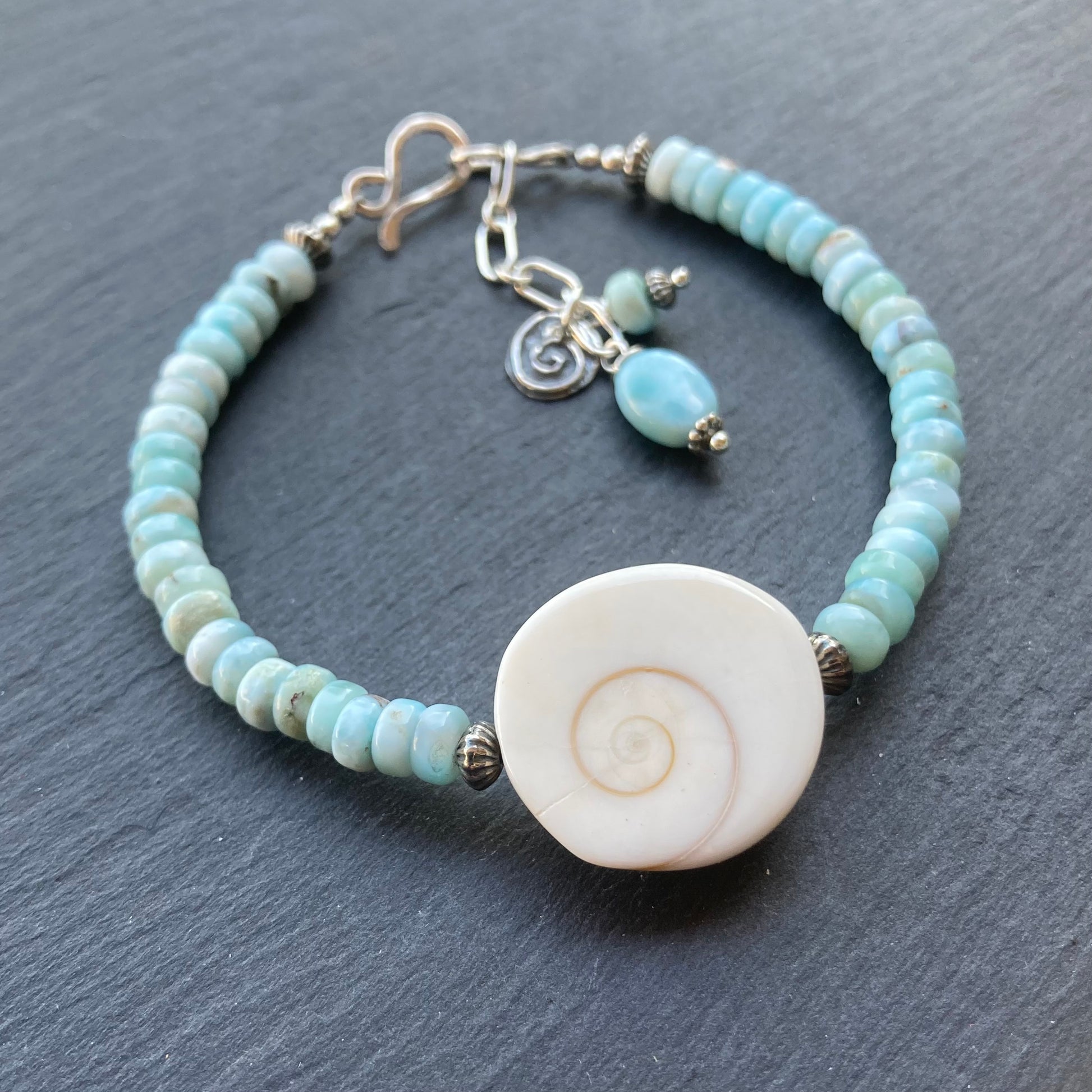 This handmade, one of a kind, beaded bracelet features a 21mm Shiva Eye shell and Natural Blue Larimar 5mm smooth heishi rondelles accented with corrugated sterling silver rondelles and is finished with a hand forged sterling silver hook clasp and 1” extension chain with Larimar and sterling silver charms. Bracelet is adjustable to fit a 6-7” wrist. Coordinating pieces listed and sold separately.