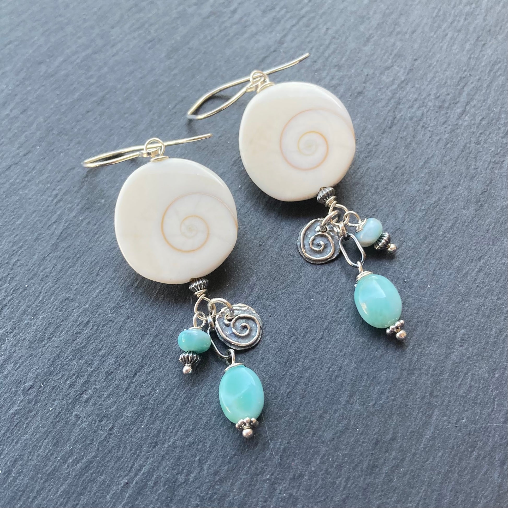 These handmade, one of a kind earrings feature 21mm Natural Shiva Eye shell and Natural Blue Larimar hand wrapped in sterling silver wire l, paired with sterling silver beads and charms and are finished with my hand forged sterling silver ear wires. Earrings measure 1 7/8” in length. Coordinating pieces listed and sold separately.