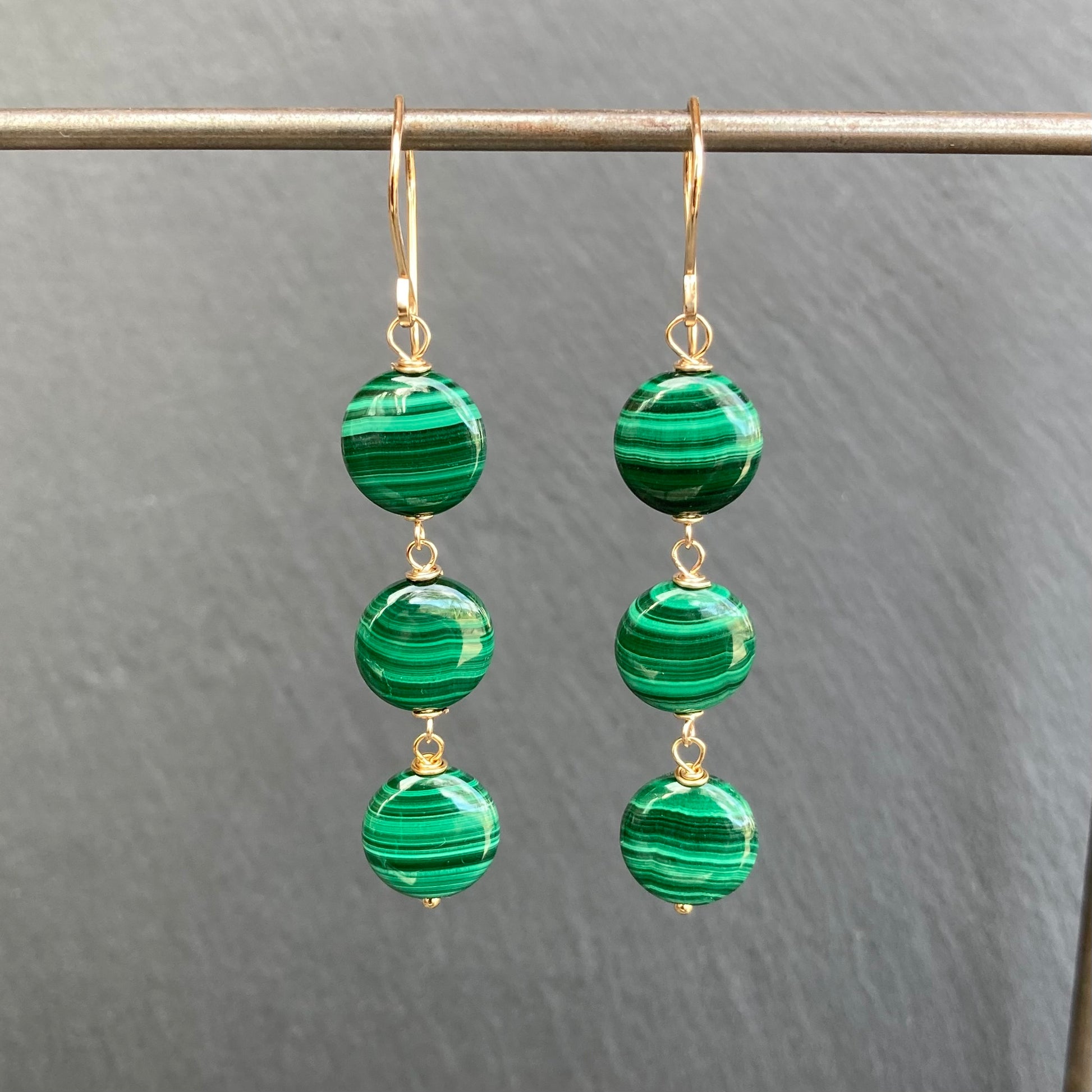 These handmade, one of a kind earrings feature high grade, AAA Natural Malachite 12mm smooth coins, hand wrapped in 14k gold filled wire and are finished with my hand forged 14k gold filled ear wires. Earrings measure 2 5/8” in length. Coordinating pieces listed and sold separately.