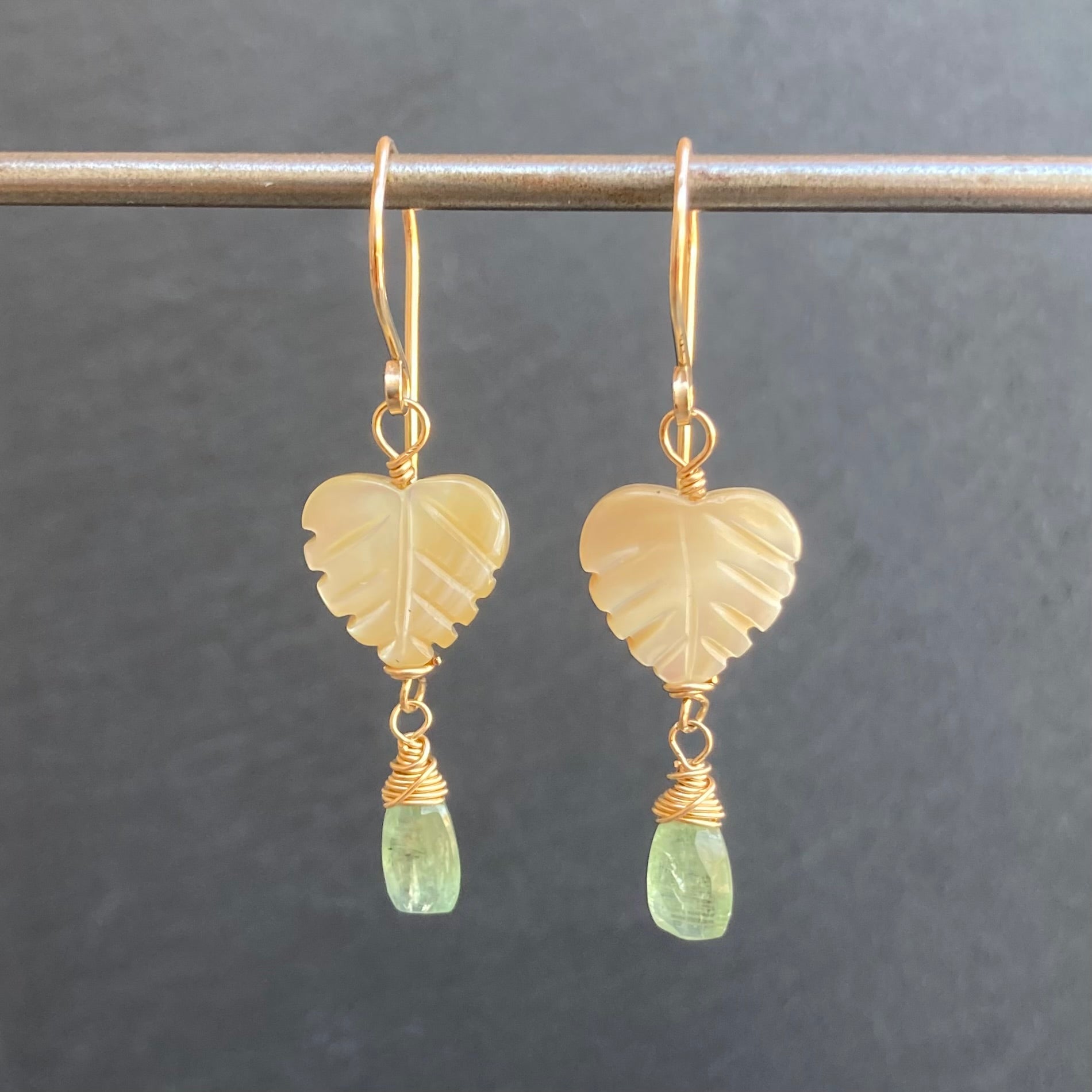 Mother of Pearl, Green Kyanite & Gold Palm Heart Earrings
