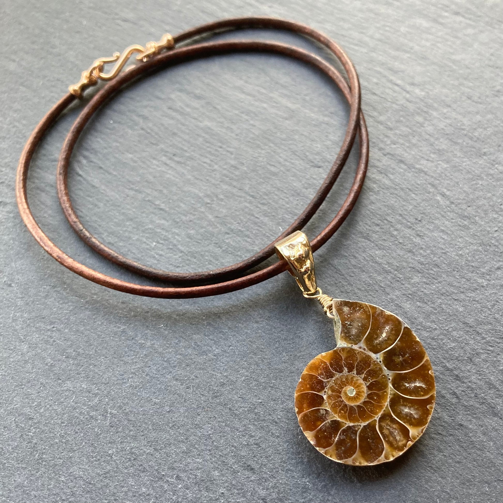 This handmade, one of a kind choker features one half of a Natural Ammonite 24x29mm fossil, hand wrapped in 14k gold filled wire suspended from an artisan bronze bail on a dark brown 2mm genuine leather cord. S-hook clasp and all hardware is solid bronze. Choker measures 16” in length. Coordinating pieces listed and sold separately.