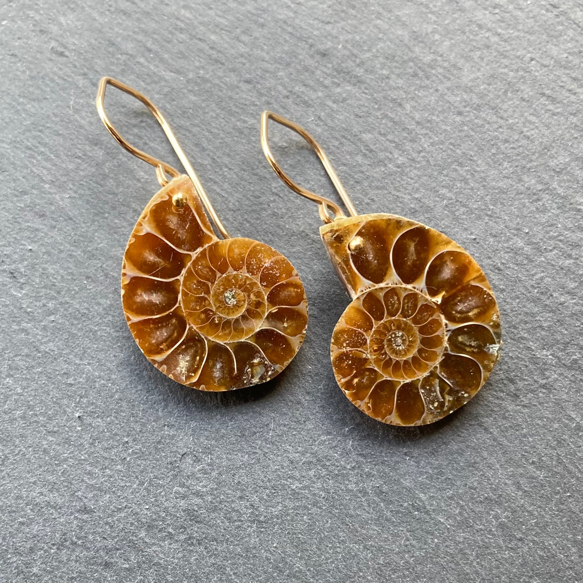 These handmade, one of a kind earrings feature a bookend sliced AAA Natural Ammonite 19x24mm fossil, hand wrapped in 14k gold filled wire and are finished with my hand forged 14k gold filled ear wires. Earrings measure just over 1.5” in length. Coordinating pieces listed and sold separately.