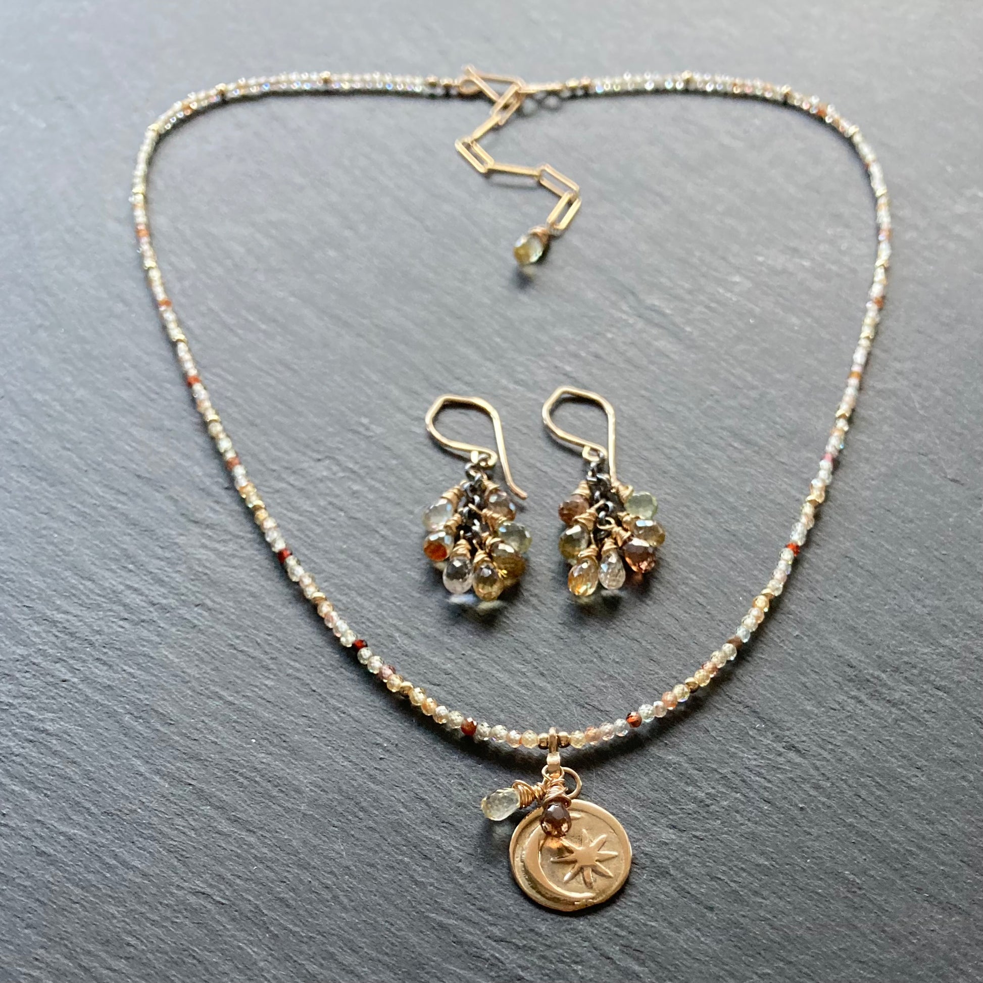 This handmade, one of a kind necklace features a solid bronze 14mm moon and star coin pendant with two Natural Zircon faceted teardrop briolette charms on a beaded necklace of sparkling multicolor Natural Zircon (Not to be confused with Cubic Zirconia, a man made Diamond simulant, Zircon is a naturally-occurring mineral, which is zirconium silicate (ZrSiO4)and is the oldest mineral on earth and is used to age date other minerals) microfaceted rounds and 14/20 gold filled seamless rounds and is finished with a hand forged 14/20 gf hook and eye clasp and 2” extension chain with a Natural Zircon faceted teardrop charm. Necklace is adjustable from 17.25-19.25” in length. Coordinating pieces listed and sold separately.