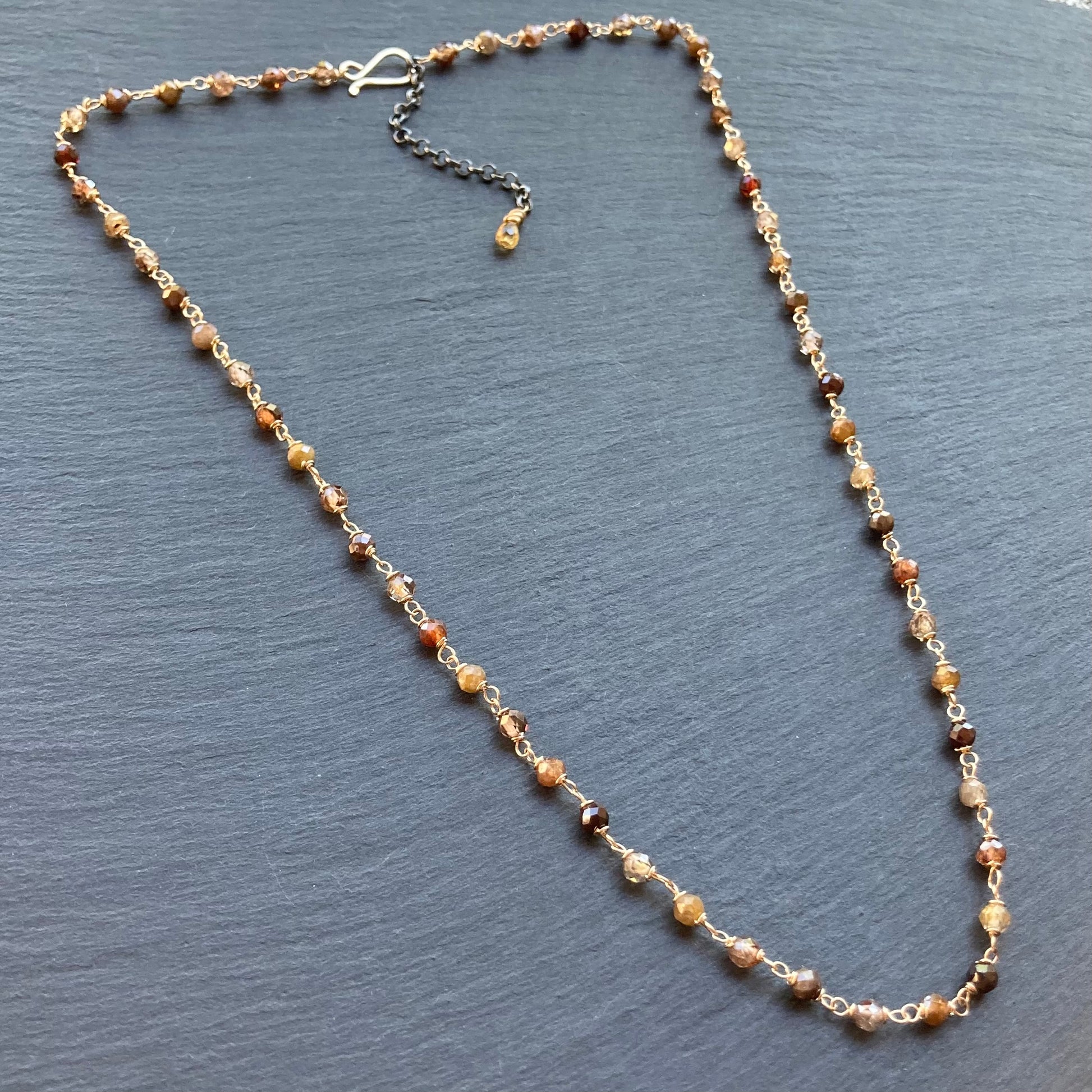 This handmade, one of a kind necklace features sparkling, multicolored Natural Zircon (Not to be confused with Cubic Zirconia, a man made Diamond simulant, Zircon is a naturally-occurring mineral, which is zirconium silicate (ZrSiO4)and is the oldest mineral on earth and is used to age date other minerals) 4mm faceted rounds, hand wrapped in 14/20 gold filled wire and is finished with a hand forged 14/20gf hook clasp and oxidized sterling silver 2” extension chain with a Natural Zircon faceted teardrop charm for an adjustable length to 23”. Coordinating pieces listed and sold separately.