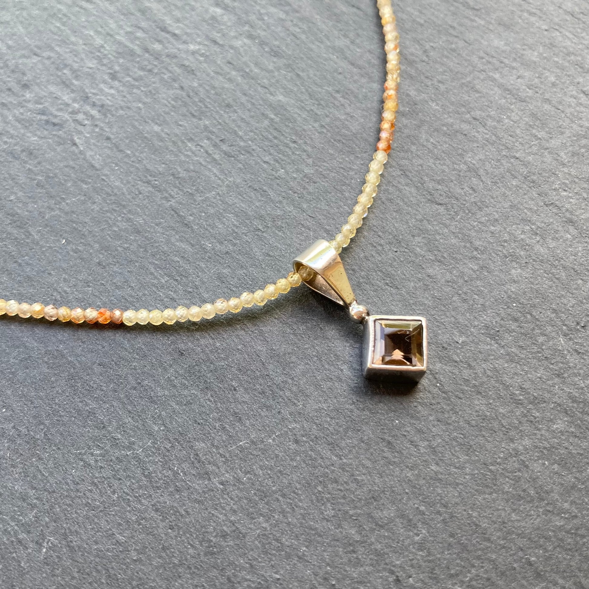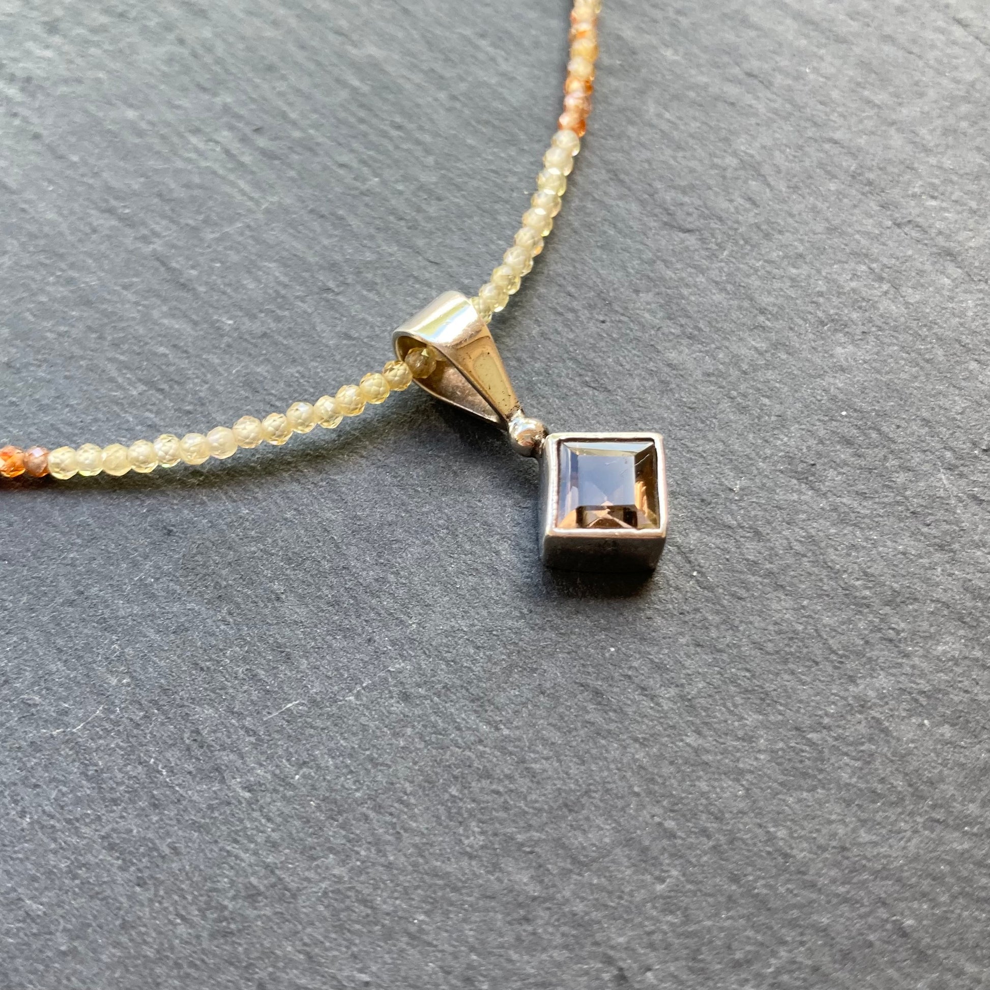 This handmade, one of a kind choker features a princess cut Smoky Quartz and sterling silver pendant on a beaded necklace of sparkling, micro faceted, gradient AAA Natural Zircon and AAA Smoky Quartz and is finished with a hand forged sterling silver hook and eye clasp and 2” extension chain for an adjustable length from 16-18”. Coordinating pieces listed and sold separately.
