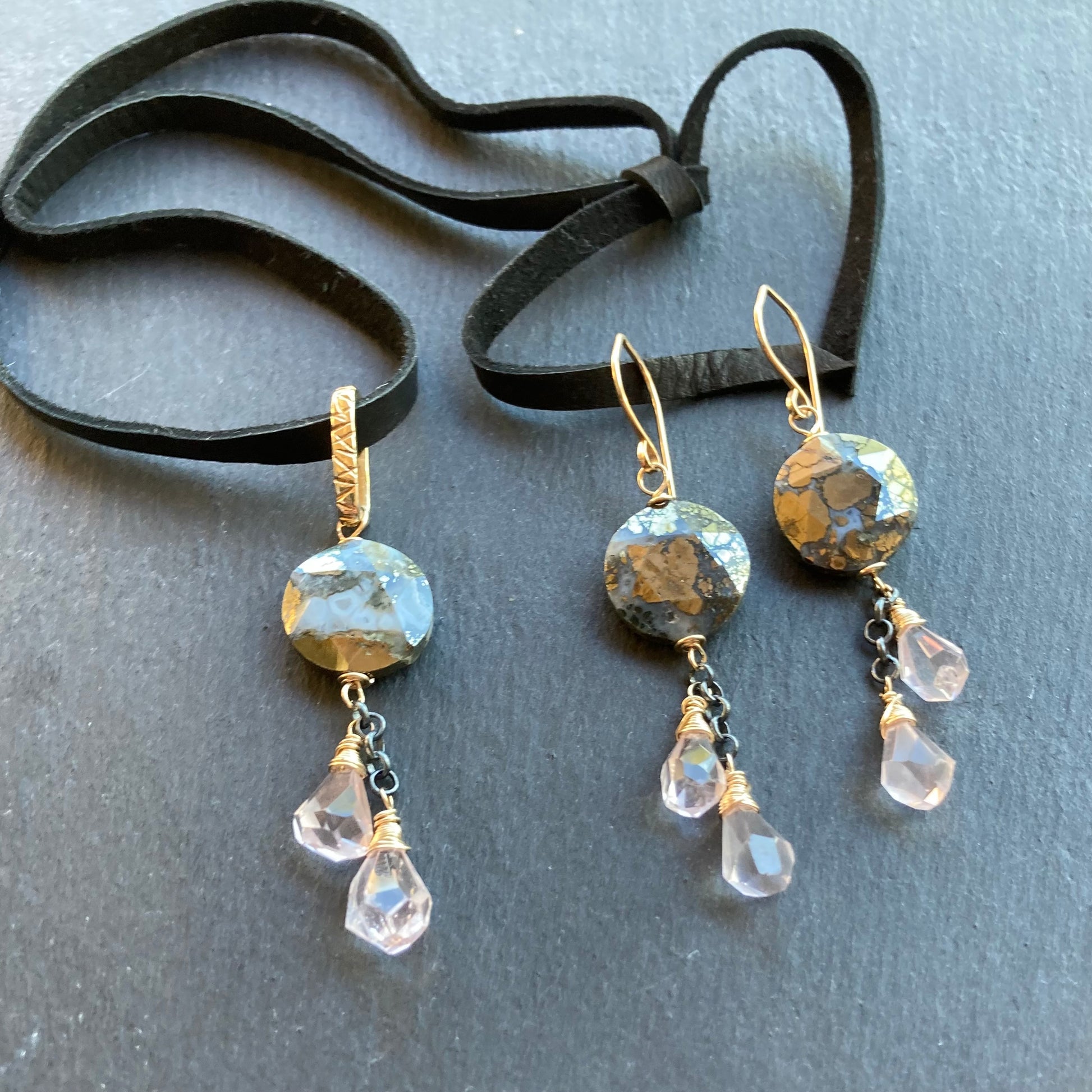 This handmade, one of a kind choker features a Nipomo Marcasite in Agate (a naturally occurring agate with blooms of metallic Marcasite and Pyrite from The Central Coast of California) 14mm star cut coin and Rose Quartz hand cut, faceted teardrop briolettes, hand wrapped in 14k gold filled wire, suspended from oxidized sterling silver rolo chain on an artisan bronze, etched bail on a 22” long black 5mm wide deer-tanned leather lace that can be tied to your desired length up to 18”. Coordinating pieces listed and sold separately.