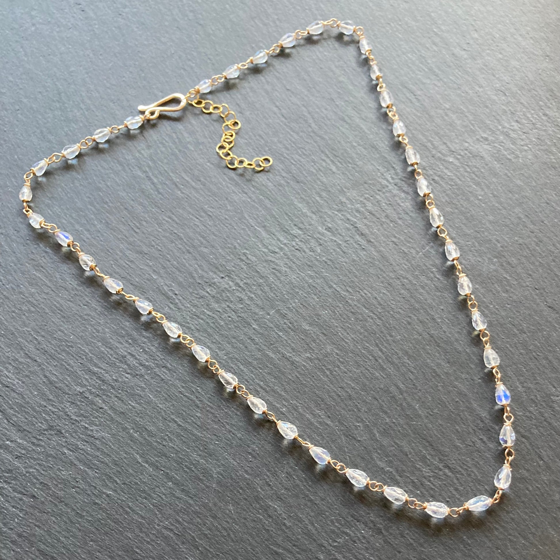 This handmade, one of a kind necklace features blue fire, gem grade AAA Rainbow Moonstone 4-6mm graduated, hand cut, faceted teardrops, that I’ve hand wrapped in 14/20 gold filled wire and finished with a hand forged 14/20 gf hook clasp and 2” extension chain. Necklace is adjustable to 18.75” in length. Coordinating pieces listed and sold separately.