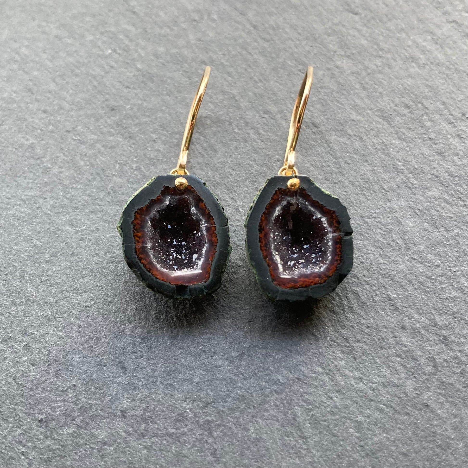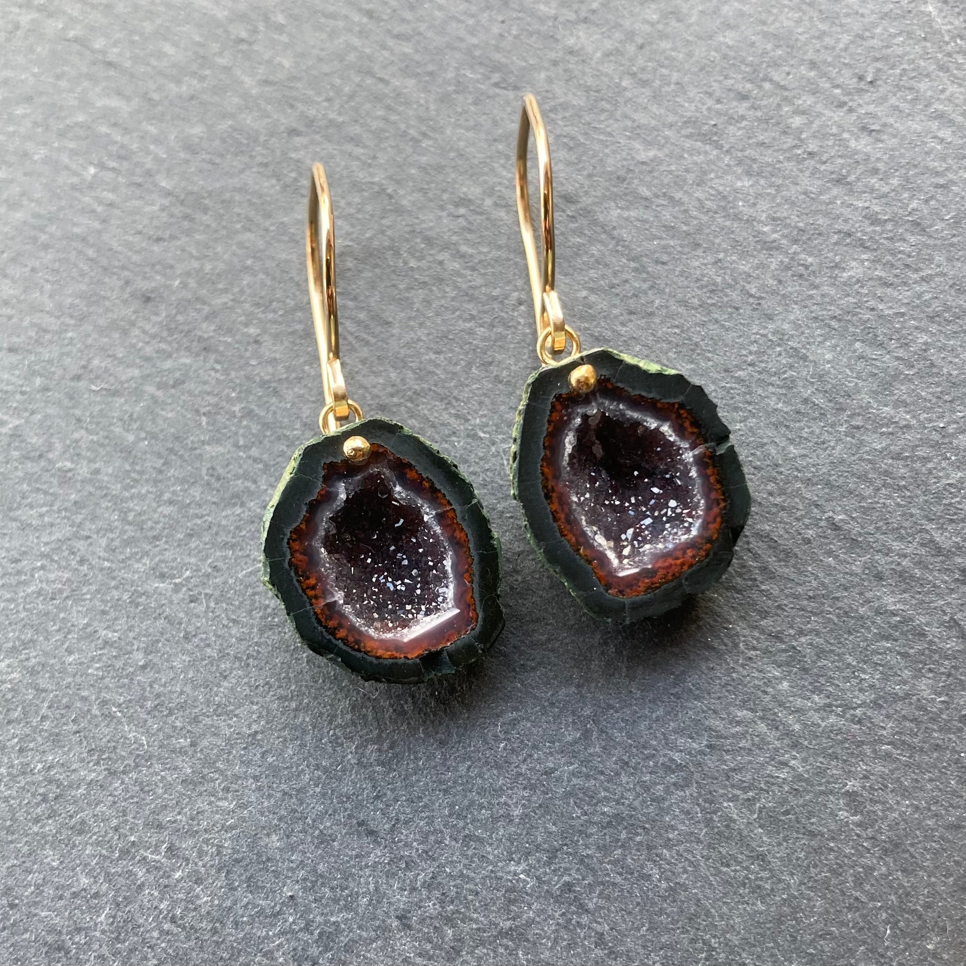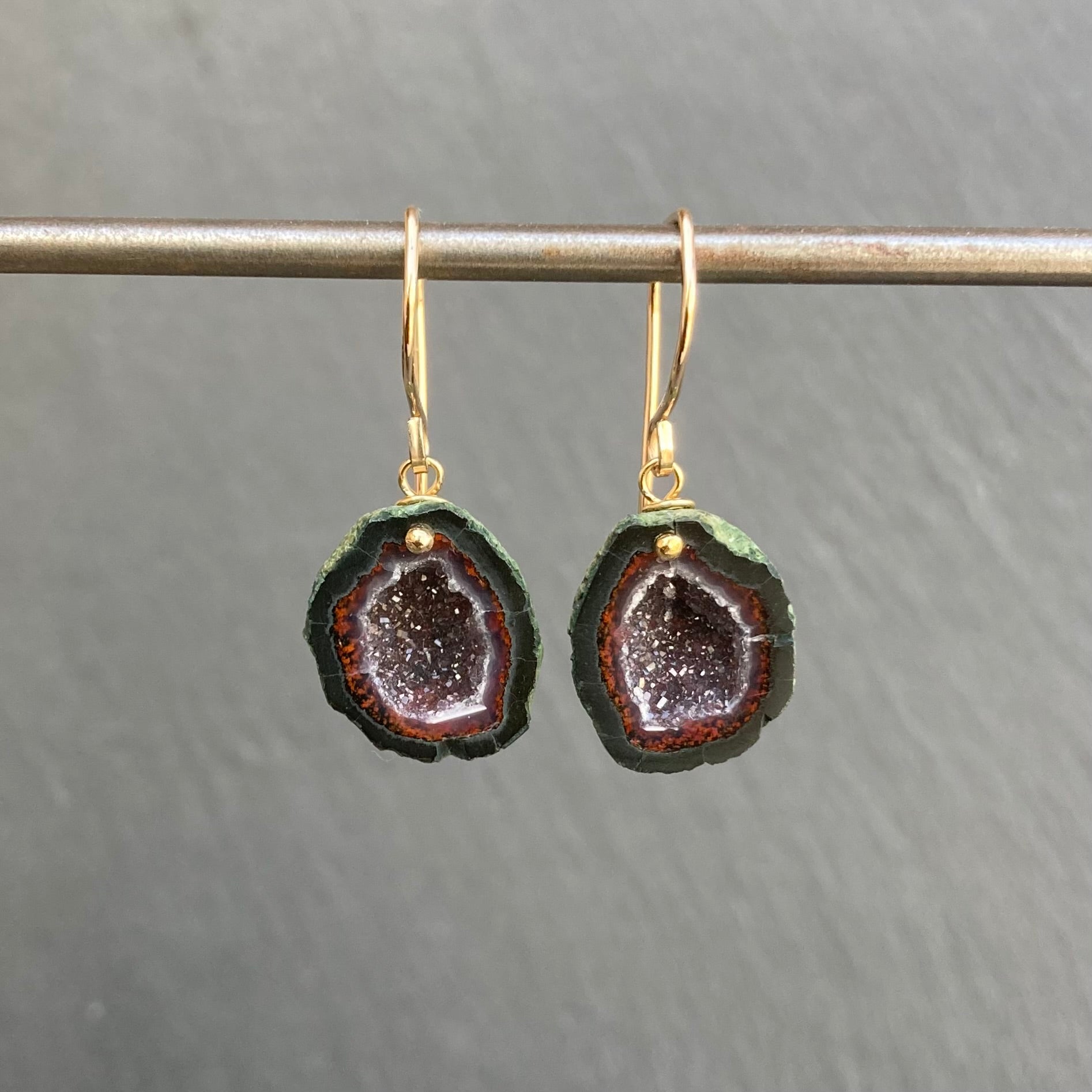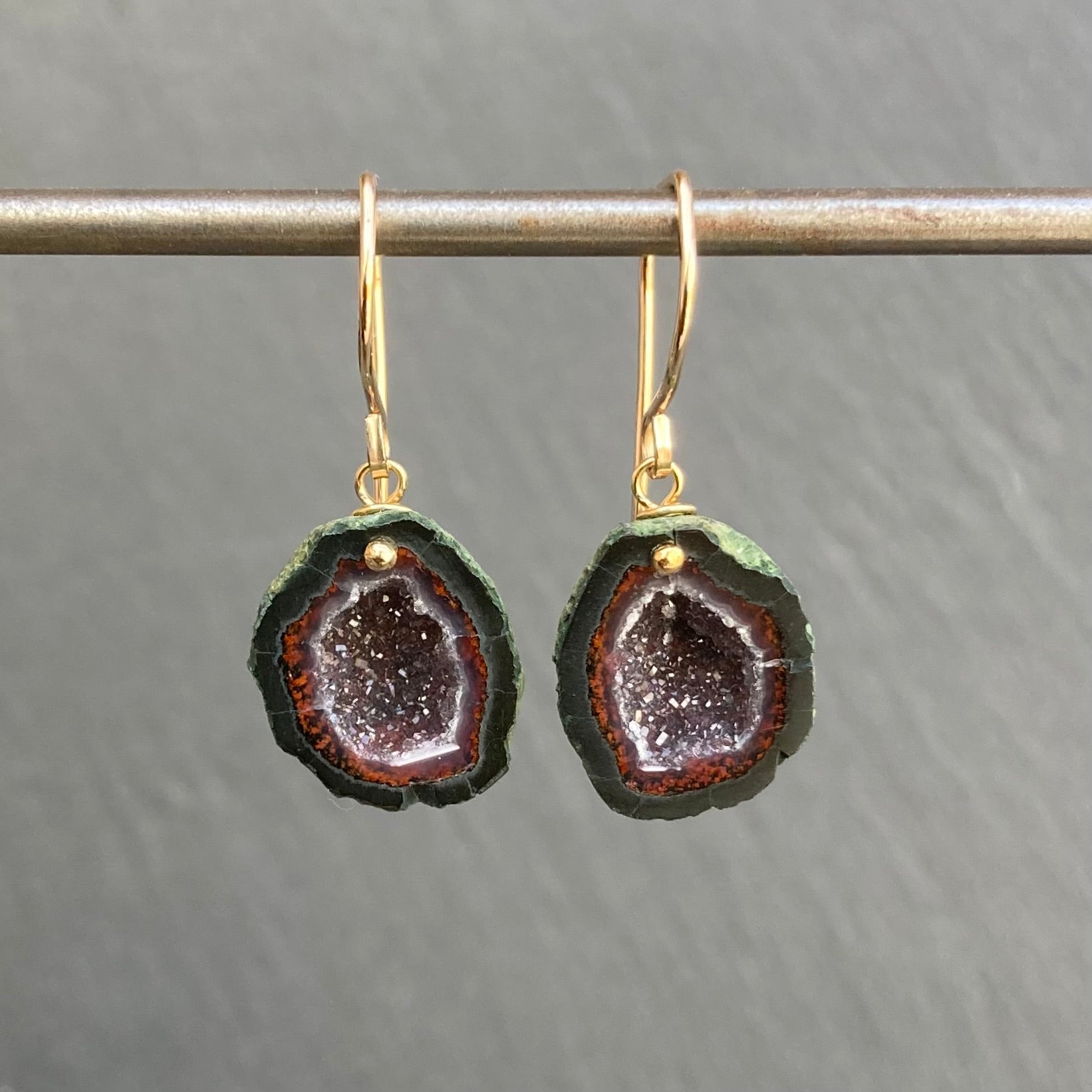 These handmade, one of a kind earrings feature 13x16mm Natural Tabasco Geodes with mauve druzy over red agate, hand wrapped in 14k gold filled wire and are finished with my hand forged 14k gold filled ear wires. Earrings measure 1.25” in length.