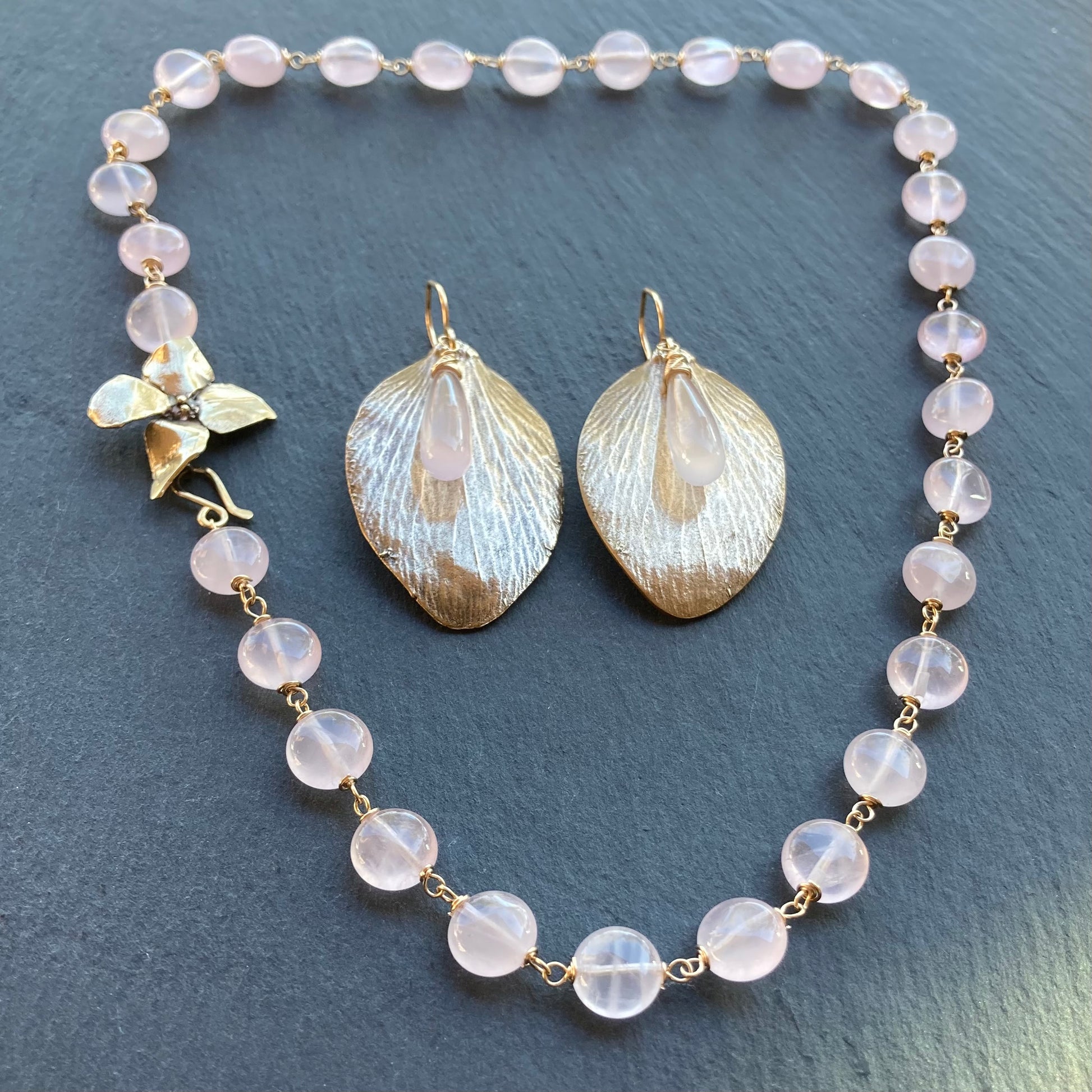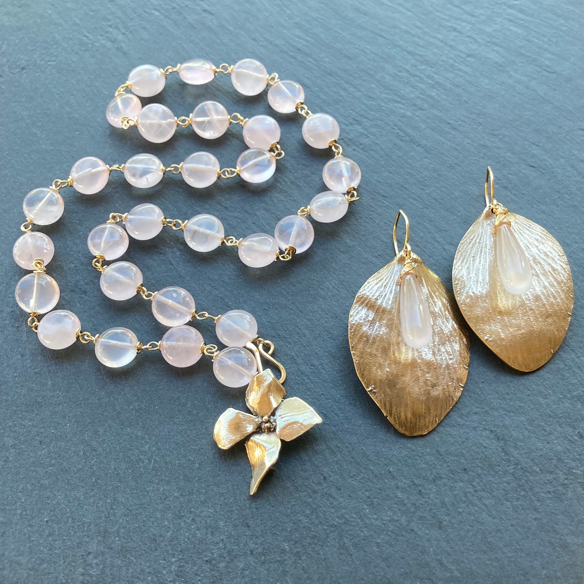 Rose Quartz, Gold & Bronze Evening Primrose Necklace