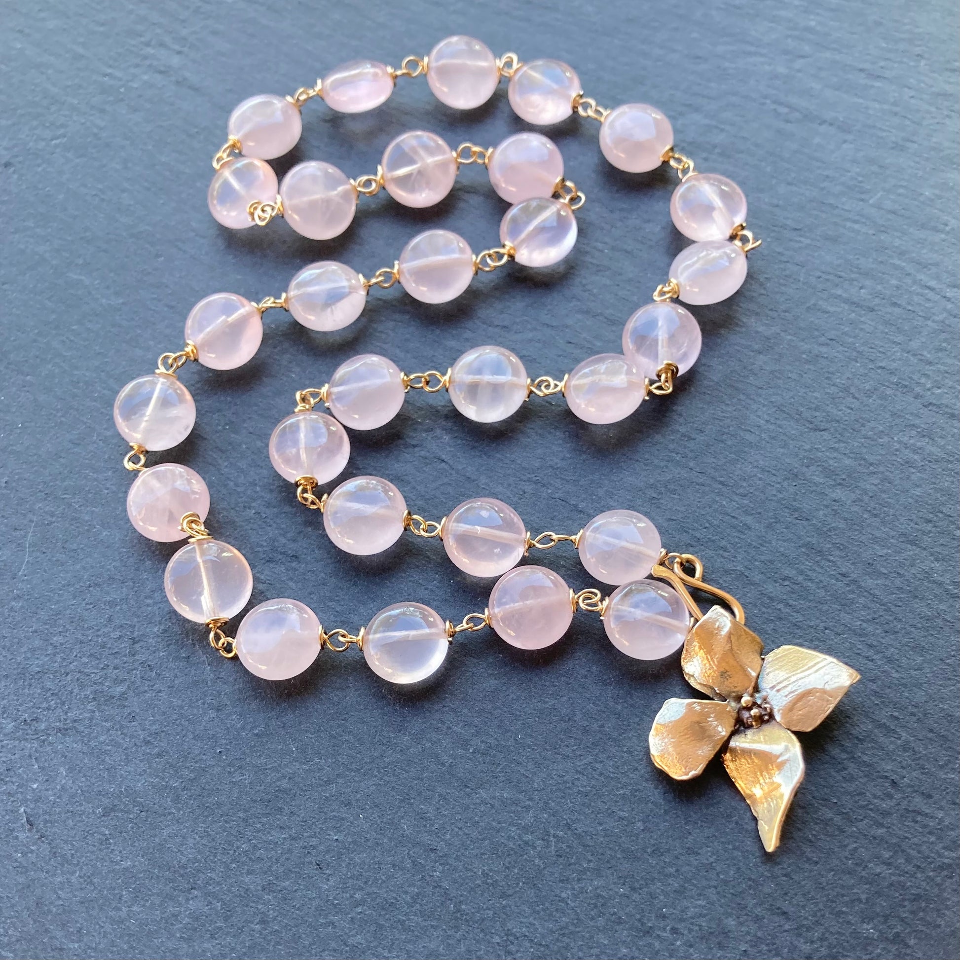 This handmade, one of a kind necklace features an artisan bronze Evening Primrose link on a handmade chain of high grade, AAA Natural Madagascar Rose Quartz 10mm smooth coins, hand wrapped in 14/20 gold filled wire and is finished with a hand forged hook clasp. Necklace measures 20” in length.