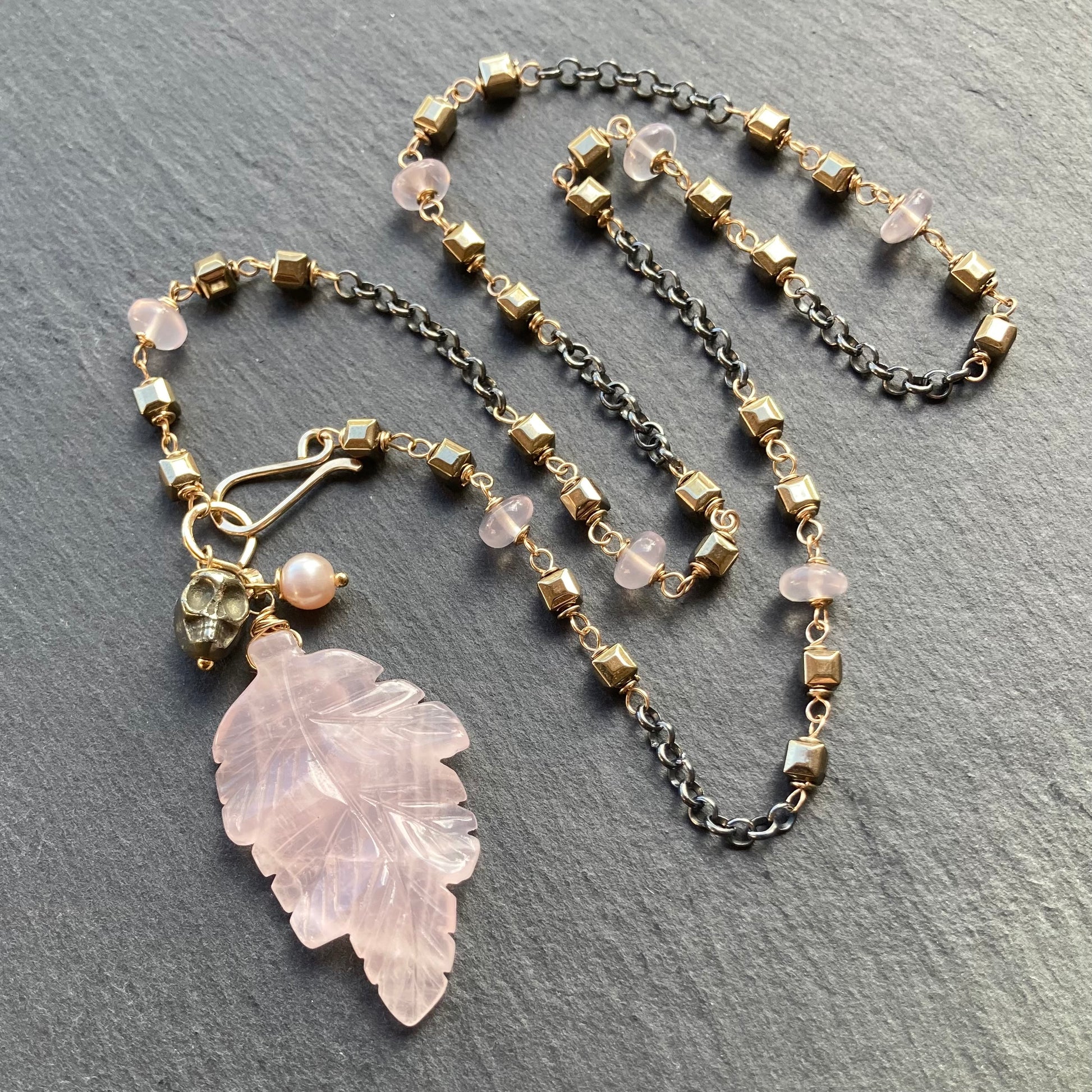 This handmade, one of a kind necklace features Natural Rose Quartz smooth rondelles and Titanium Pyrite faceted cubes, hand wrapped in 14k gold filled wire, connecting links of oxidized sterling silver Rolo chain and is finished with a front facing, hand forged 14k gold filled hook clasp and bail with a Natural Rose Quartz hand carved leaf pendant, a hand carved Pyrite skull and a Natural Freshwater Pink Pearl. Necklace measures 18.5” in length. Coordinating pieces listed and sold separately.