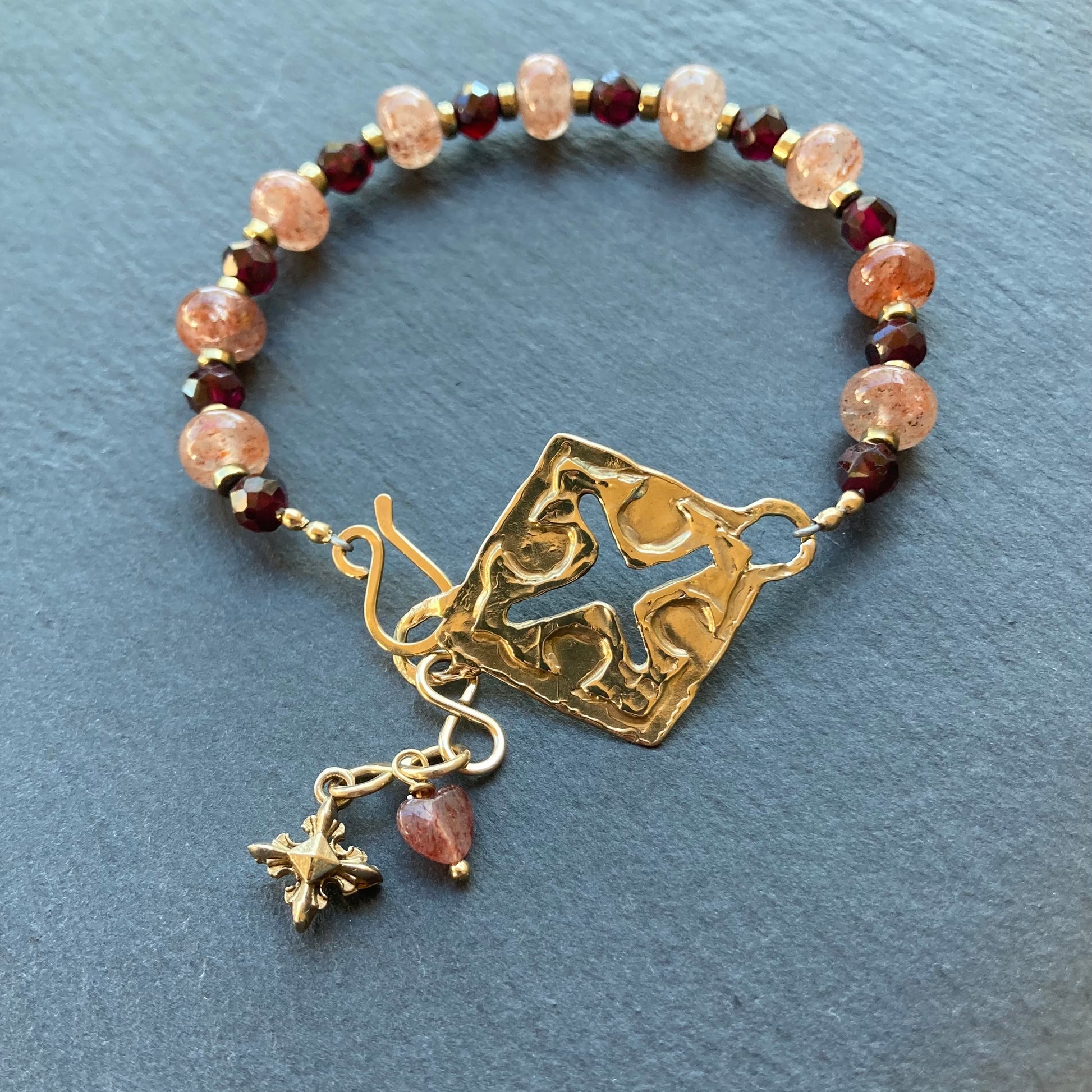 This handmade, one of a kind bracelet features an artisan bronze Santa Fe Cross focal link on a beaded bracelet of speckled Natural Strawberry Quartz 7-8mm smooth rondelles, burgundy Rhodolite Garnet rose cut rounds and metallic Titanium Pyrite heishi beads and is finished with a hand forged 14/20 gold filled hook clasp and 1” of infinity extension links with Strawberry Quartz heart and artisan bronze cross charms. Bracelet is adjustable to fit up to a 7” wrist. Coordinating pieces listed and sold separately.