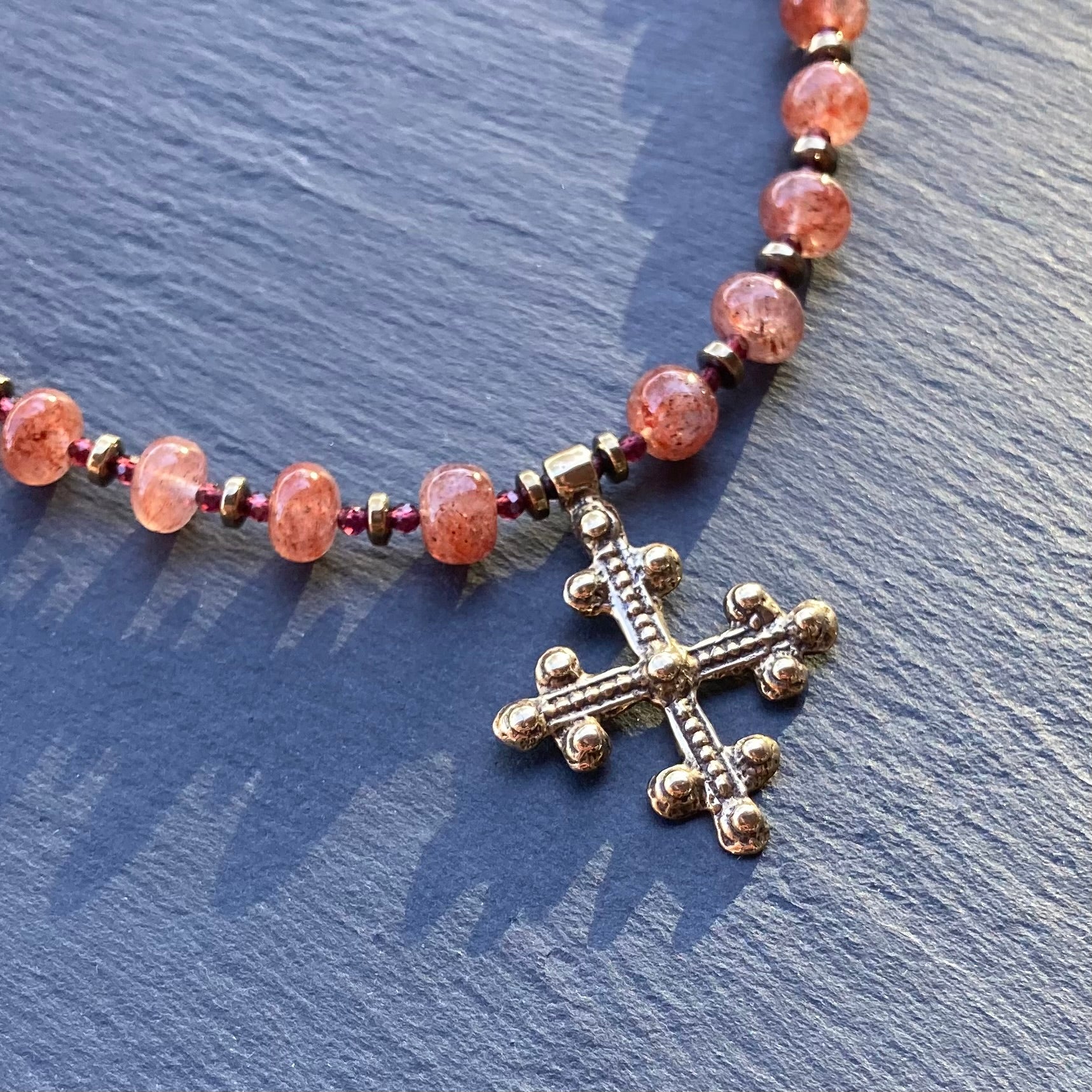Strawberry Quartz, Garnet & Bronze Coptic Cross Necklace