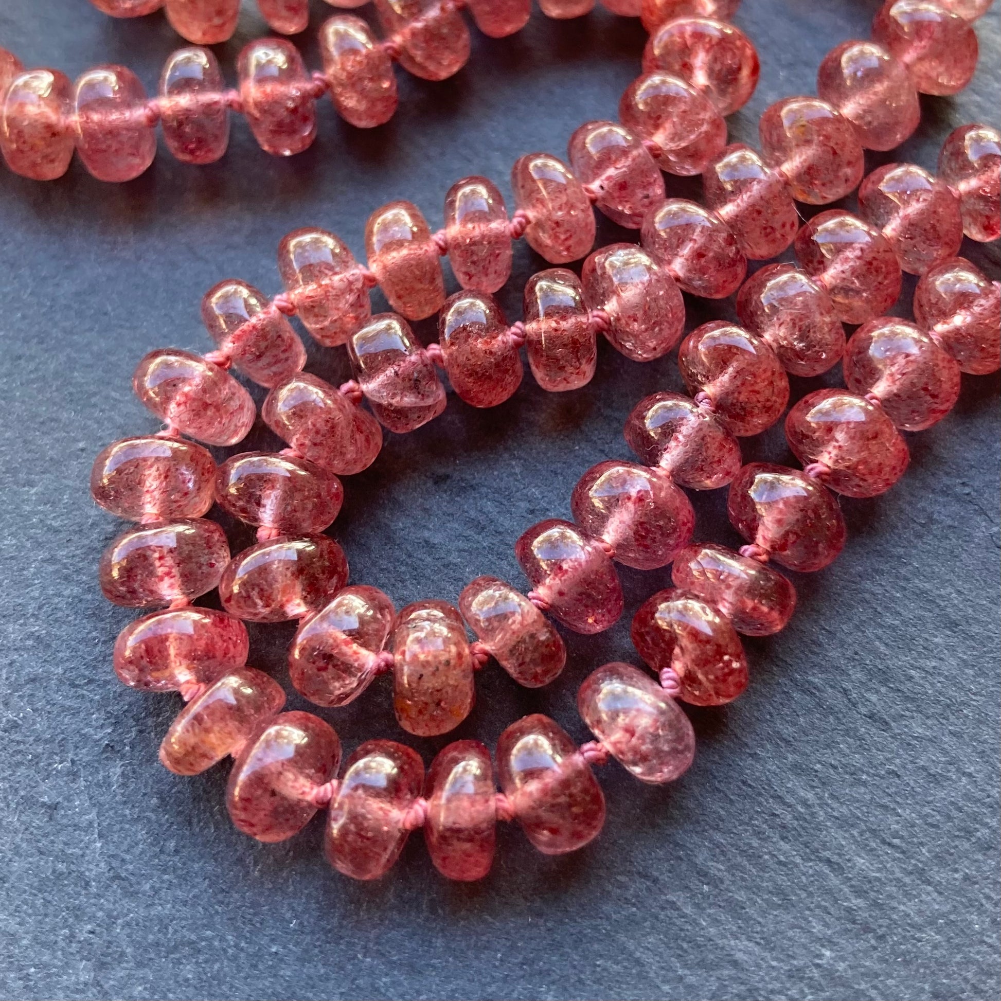 This handmade, one of a kind necklace features Natural Strawberry Quartz 6.5mm smooth rondelles hand knotted on rose pink silk cord and is finished with a hand forged 14k gold filled hook and eye clasp and 2” extension chain. Necklace measures 20.75-22.75” in length. Coordinating pieces listed and sold separately.