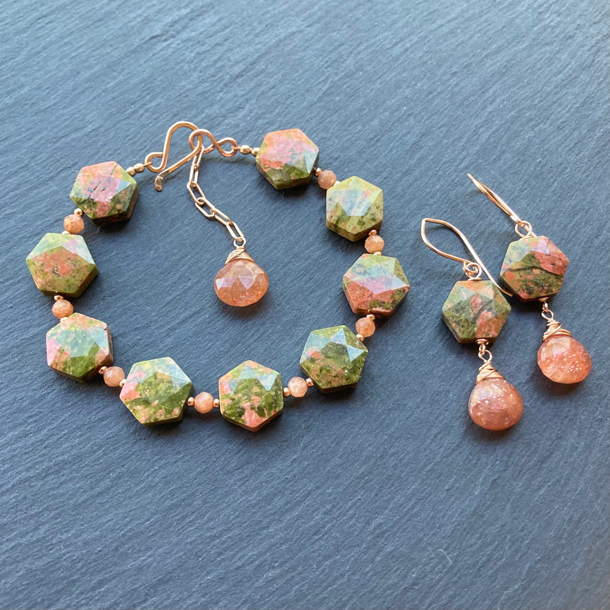 These handmade, one of a kind earrings feature green and rusty orange Natural Unakite 12mm faceted hexagons and sparkling Natural Oregon Sunstone faceted heart briolettes, hand wrapped in 14/20 rose gold filled wire and are finished my hand forged 14/20rgf ear wires. Earrings measure just under 2” in length. Coordinating pieces listed and sold separately.